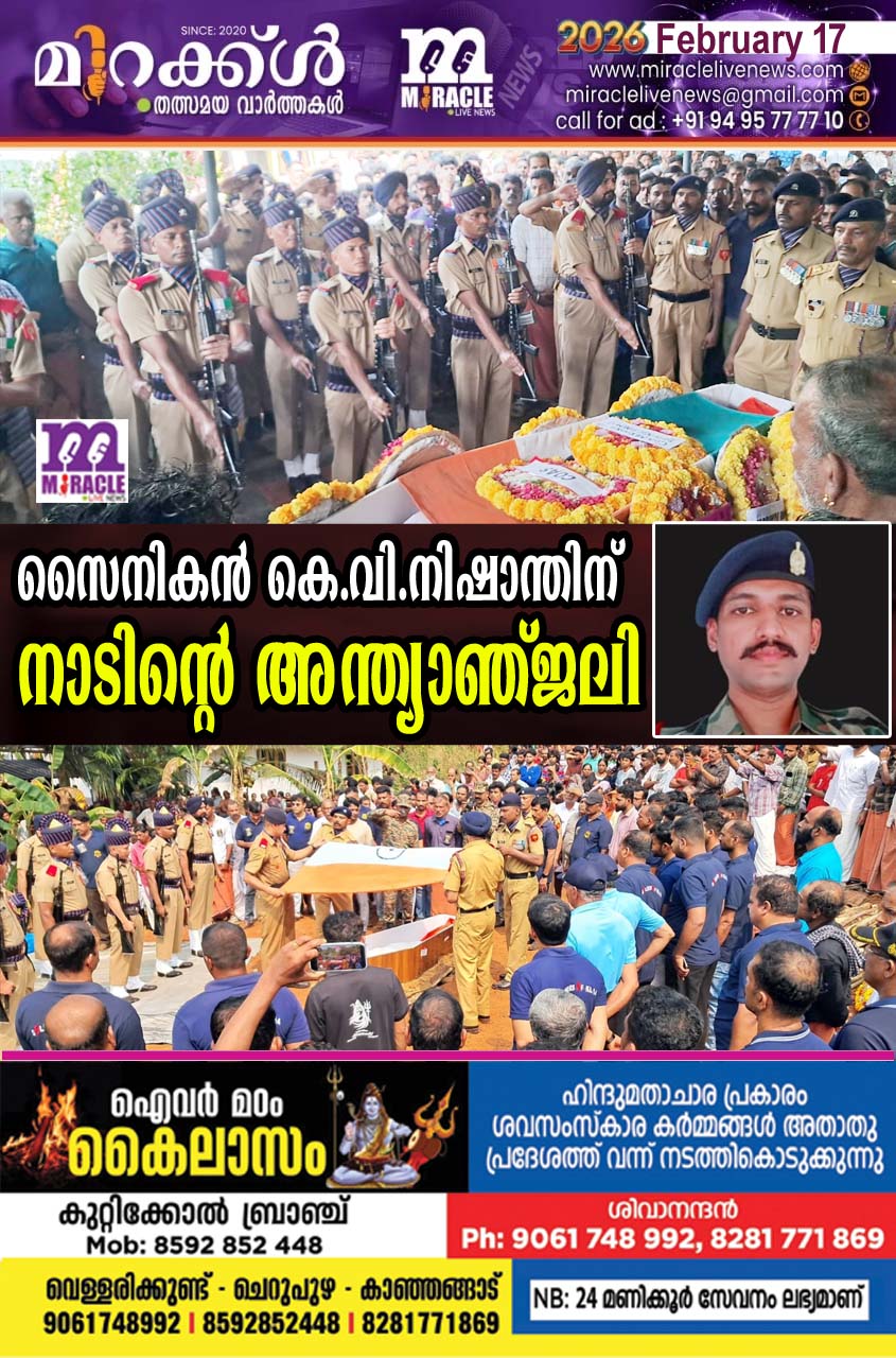 മടിക്കൈ: ഡല്ഹിയിലെ താമസസ്ഥലത്ത് മരണപ്പെട്ട സൈനികന് മടിക്കൈ ഏച്ചിക്കാനം ചെമ്പിലോട്ട് കുണ്ടുവളപ്പ് വീട്ടില് കെ.വി.നിഷാന്തിന്റെ (32) മൃതദേഹം ഔദ്യോഗിക ബഹുമതികളോടെ വീട്ടുവളപ്പില് സംസ്ക്കരിച്ചു. ഇന്നലെ രാത്രി മാവുങ്കാല് സഞ്ജീവനി ആശുപത്രിയിലെത്തിച്ച മൃതദേഹം രാവിലെ മടിക്കൈ അമ്പലത്തുകര വായനശാല പരിസരത്തും ഏച്ചിക്കാനം ഗുരുജി വിദ്യാലയത്തിന് സമീപത്തും പൊതുദര്ശത്തിന് വെച്ചശേഷം വീട്ടിലെത്തിച്ചു. തുടര്ന്നാണ് ഔദ്യോഗിക ബഹുമതികളോടെ മൃതദേഹം സംസ്ക്കരിച്ചത്. ഔദ്യോഗിക ചടങ്ങുകള്ക്ക് കണ്ണൂര് സെന്റര് ഡി എസ് സി സുബൈദര് മേജര് ദില് സിംഗ് നേതൃത്വം വഹിച്ചു.