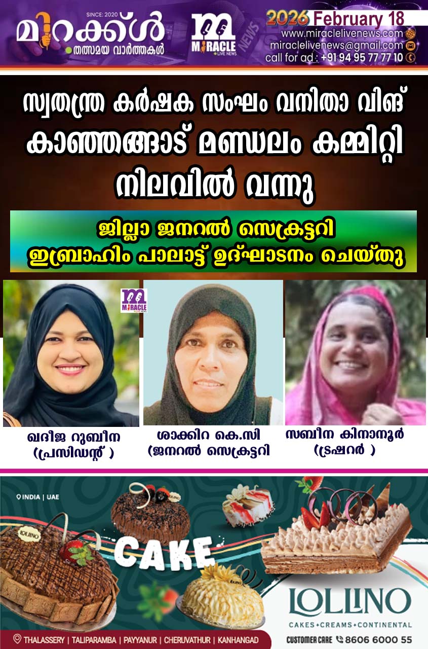 കാഞ്ഞങ്ങാട് : സ്വതന്ത്ര കര്‍ഷക സംഘം വനിതാ വിംങ് കാഞ്ഞങ്ങാട് മണ്ഡലം യോഗവും, സ്‌നേഹാദര ചടങ്ങും മുസ്ലിം ലീഗ് കാഞങ്ങാട് മുനിസിപ്പല്‍ കമ്മിറ്റി ഓഫീസില്‍ നടന്നു. സ്വതന്ത്ര കര്‍ഷക സംഘം കാഞ്ഞങ്ങാട് മണ്ഡലം പ്രസിഡന്റ് പി. അബൂബക്കര്‍ ഹാജിയുടെ അധ്യക്ഷതയില്‍ ജില്ലാ ജനറല്‍ സെക്രട്ടറി ഇബ്രാഹിം പാലാട്ട് ഉദ്ഘാടനം ചെയ്തു. മുസ്ലിം ലീഗ് കാഞ്ഞങ്ങാട് മുനിസിപ്പല്‍ പ്രസിഡന്റ് എം.പി.ജാഫര്‍ മുഖ്യപ്രഭാഷണം നടത്തി. ചടങ്ങില്‍ കാഞ്ഞങ്ങാട് മുനിസിപ്പല്‍ വികസന കാര്യ സ്റ്റാന്റിങ് കമ്മിറ്റി ചെയര്‍മാനായി തിരെഞ്ഞെടുക്കപ്പെട്ട എം. പി.ജാഫറിനെ കര്‍ഷക സംഘം ജില്ലാ ജനറല്‍ സെക്രട്ടറി ഇബ്രാഹിം പാലാട്ട് സ്‌നേഹോപഹാരം നല്‍കി, അജാനൂര്‍ പഞ്ചായത്ത് ക്ഷേമകാര്യ സ്റ്റാന്റിങ് കമ്മിറ്റി ചെയര്‍പേഴ്‌സണായി തിരെഞ്ഞെടുക്കപ്പെട്ട സി.കുഞ്ഞാമിനക്കുള്ള സ്‌നേഹാദരം സംസ്ഥാന വൈസ് പ്രസിഡന്റ് ഖദീജ ഹമീദ് സമ്മാനിച്ചു. സ്വതന്ത്ര കര്‍ഷക സംഘം വനിതാ വിങ് കാസര്‍കോട് ജില്ലാ പ്രസിഡന്റായി തിരഞ്ഞെടുക്കപ്പെട്ട പി.എം. ഫാത്തിമ ടീച്ചറിനുള്ള സ്‌നേഹാദരം മണ്ഡലം സ്വതന്ത്ര കര്‍ഷക സംഘം പ്രസിഡന്റ് പി. അബൂബക്കര്‍ ഹാജിയും സമ്മാനിച്ചു. എന്‍.എ.ഉമര്‍ സ്വാഗതം പറഞ്ഞു ചടങ്ങില്‍ അജാനൂര്‍ പഞ്ചായത്ത് മുസ്ലിം ലീഗ് ജനറല്‍ സെക്രട്ടറി ബഷീര്‍ ചിത്താരി, കര്‍ഷക സംഘം മണ്ഡലം ട്രഷറര്‍ എ.അബ്ദുള്ള ഹാജി,വനിതാ ലീഗ് അജാനൂര്‍ പഞ്ചായത്ത് ജനറല്‍ സെക്രട്ടറി ഹാജറ സലാം, വനിതാ വിങ് ജില്ലാ സെക്രട്ടറി ഖൈറുന്നിസ തുടങ്ങിയവര്‍ സംസാരിച്ചു. ഭാരവാഹികളായി ഖദീജ റുബീന (പ്രസിഡന്റ് ),ശാക്കിറ കെ.സി (ജനറല്‍ സെക്രട്ടറി ),സബീന കിനാനൂര്‍ (ട്രഷറര്‍ ),കുഞ്ഞാസിയ മീനാപ്പീസ്,