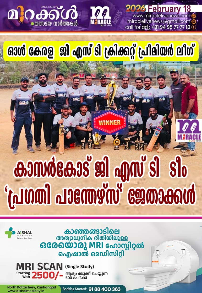കാഞ്ഞങ്ങാട്: ഇടുക്കിയില് നടന്ന ഓള് കേരള ജി എസ് ടി ക്രിക്കറ്റ് പ്രീമിയര് ലീഗില് കാസര്കോട് ജി എസ് ടി ടീം ‘പ്രഗതി പാന്തേഴ്സ്’ ജേതാക്കളായി. ഫൈനലില് ശക്തരായ എറണാകുളം ടീമിനെ ഒമ്പത് റണ്സിനു തോല്പ്പിച്ചാണ് കാസര്കോട് ടീം കപ്പ് നേടിയത്. 6 ഓവര് മത്സരത്തില് ആദ്യം ബാറ്റ് ചെയ്ത കാസര്കോട് ടീം 3 വിക്കറ്റ് നഷ്ടത്തില് 90 റണ് നേടി. എന്നാല് എറണാകുളം ടീമിന് നാല് വിക്കറ്റ് നഷ്ടത്തില് 81 റണ് നേടാനെ സാധിച്ചുള്ളു. ഫൈനല് മത്സരത്തില് 21 പന്തില് 64 റണ്സ് നേടിയ കാഞ്ഞങ്ങാട് ഇന്റലിജന്സ് ഓഫീസിലെ ശിവ കീര്ത്തി. എസ് മാന് ഓഫ് ദ മാച്ച് ആയി. ടൂര്ണമെന്റിലെ മികച്ച താരമായി കാസര്കോട് പ്രഗതി പന്തേഴ്സിന്റെ അക്ഷയ് ടി തെരഞ്ഞെടുക്ക പ്പെട്ടു. ടൂര്ണമെന്റിലുടനീളം ബാറ്റിംഗിലും ബൗളിംഗിലും ഒരുപോലെ മികവ് പുലര്ത്തിയ ടീം ഒരു കളിയും തോല്ക്കാതെ ആണ് ജേതാക്കളായത്. ടീം അംഗങ്ങള് : ശരത്. പി (ക്യാപ്റ്റന്), അഭിജിത്ത് ബാബു കെ, അക്ഷത് എ.ആര്, അക്ഷയ്. ടി, പവിത്രന്. എം, പ്രണവ് കെ, സുബിന് എ. കെ, രാംജിത്ത് വി, ശ്രീജിത്ത് കുമാര് ബി, അക്ഷയ്കുമാര് കെ, സജീവന് ടി. സി, ഹരീഷ്കുമാര് കെ. എം, ശിവകീര്ത്തി. എസ്, ആനന്ദ് അശോക്.