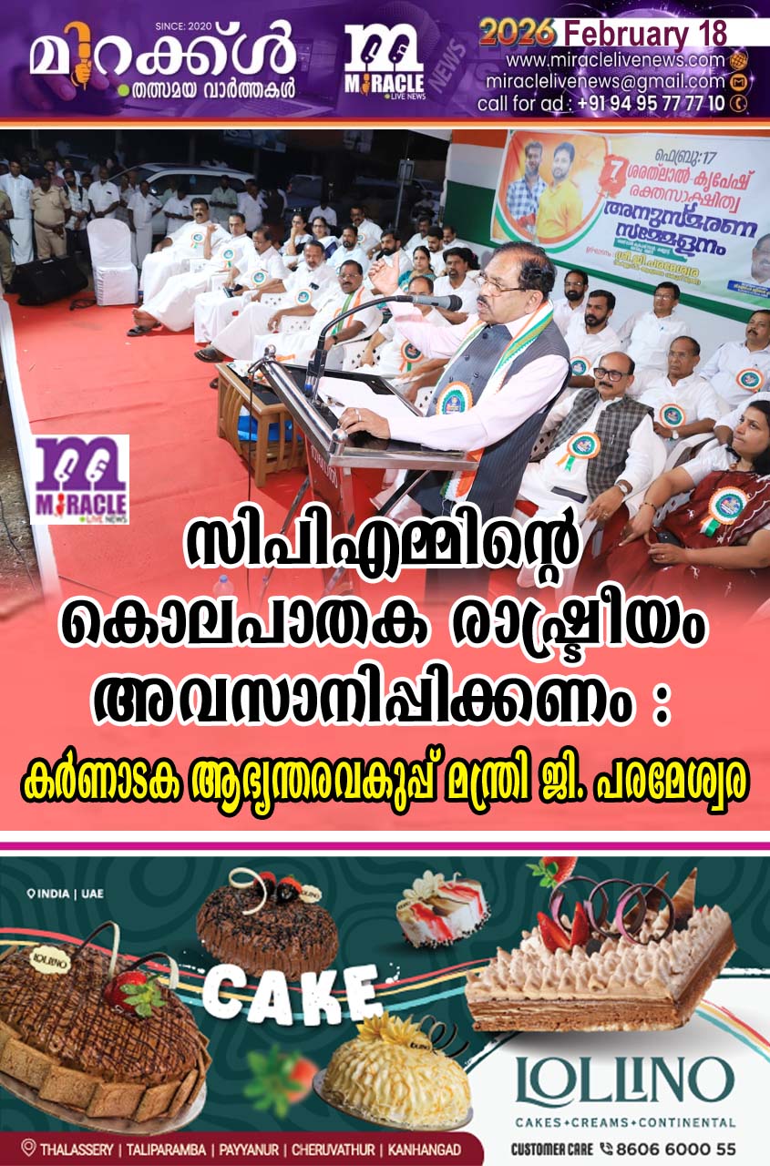 പെരിയ: മനുഷ്യനെ ഉന്മൂലനം ചെയ്തുകൊണ്ടുള്ള രാഷ്ട്രീയം കാലഹരണപ്പെട്ടതാണെന്നും നാടിന്റെ സ്വസ്ഥത തകര്‍ക്കുകയും പുരോഗതി തടസ്സപ്പെടുത്തുകയും ചെയ്യുന്ന പകയുടെ രാഷ്ട്രീയം സിപിഎം അവസാനിപ്പിക്കണമെന്നും കര്‍ണാടക സംസ്ഥാന ആഭ്യന്തര മന്ത്രി ജി പരമേശ്വര ആവശ്യപ്പെട്ടു. ഇന്ത്യയില്‍ സിപിഎം ഭരണം നടത്തിയേടത്തെല്ലാം മനുഷ്യനോടുള്ള അഹിസഹിഷ്ണുത മൂലം നാട്ടില്‍ രക്തപ്പുഴ തീര്‍ത്തിട്ടുണ്ട് അക്കാരണത്താല്‍ തന്നെ ജനങ്ങള്‍ കമ്മ്യൂണിസ്റ്റ് പാര്‍ട്ടിയെ നാട്ടില്‍ നിന്നും തുടച്ചു മാറ്റുന്നുണ്ടെന്നും അദ്ദേഹം ഓര്‍മിപ്പിച്ചു. വര്‍ഗീയ താല്‍പ്പര്യത്താല്‍ നാട്ടില്‍ അനൈക്യം ഉണ്ടാക്കുന്ന ബിജെപിയും രാഷ്ട്രീയത്തില്‍ മനുഷ്യനെ കൊലപ്പെടുത്തുന്ന സിപിഎമ്മും ഒരു നാണയത്തിന്റെ രണ്ടു വശങ്ങളാണ് എന്നും മന്ത്രി പ്രസ്താവിച്ചു. ശരത് ലാല്‍ കൃപേഷ് ഏഴാമം രക്തസാക്ഷിത്വ ദിനാചരണതോട് അനുഭാധിച്ചു ജില്ലാ കോണ്‍ഗ്രസ് കമ്മിറ്റിയുടെ നേതൃത്വത്തില്‍ കല്ല്യോട്ട് ശരത് ലാല്‍ കൃപേഷ് നഗറില്‍ നടന്ന അനുസ്മരണ സമ്മേളനം ഉദ്ഘാടനം ചെയ്തു സംസാരിക്കുകയായിരുന്നു അദ്ദേഹം. ശരത് ലാല്‍ കൃപഷ് രക്തസാക്ഷികളുടെ പേരില്‍ കല്യോട്ട് നിര്‍മ്മിക്കുന്ന സാംസ്‌കാരിക കേന്ദ്രത്തിന്റെ നിര്‍മ്മാണ ചിലവ് പൂര്‍ണമായും കര്‍ണാടക കോണ്‍ഗ്രസ് കമ്മിറ്റി വഹിക്കുമെന്ന് അദ്ദേഹം അറിയിച്ചു.ഡിസിസി പ്രസിഡണ്ട് പി കെ ഫൈസല്‍ അധ്യക്ഷത വഹിച്ചു. യോഗത്തില്‍ രാജ്‌മോഹന്‍ ഉണ്ണിത്താന്‍ എം പി അനുസ്മരണ പ്രഭാഷണം നടത്തി സംസ്ഥാന യൂത്ത് കോണ്‍ഗ്രസ് പ്രസിഡണ്ട് ഓ ജെ ജനീഷ് മുഖ്യാതിഥിയായി സംസാരിച്ചു . ഡിസിസി ജനറല്‍ സെക്രട്ടറി എം സി പ്രഭാകരന്‍ സ്വാഗതം പറഞ്ഞു. കെപിസിസി ജനറല്‍ സെക്രട്ടറിമാരായ കെ നീലകണ്ഠന്‍, ഹക്കീം കുന്നില്‍, യുഡിഎഫ് ജില്ലാ കണ്‍വീനര്‍ ഏ ഗോവിന്ദന്‍ നായര്‍, കോണ്‍ഗ്രസ് നേതാക്കളായ ടി എം സഹിദ്, ബാലകൃഷ്ണന്‍ പെരിയ,കരിമ്പില്‍ കൃഷ്ണന്‍, ശാന്തമ്മ ഫിലിപ്പ്,മീനാക്ഷി ബാലകൃഷ്ണന്‍ അഡ്വ കെ കെ രാജേന്ദ്രന്‍, പിജി ദേവ് ബി പി പ്രദീപ്കുമാര്‍ എന്നിവര്‍ സംസാരിച്ചു, പിവി സുരേഷ്, രാജന്‍ പെരിയ, ധന്യാ സുരേഷ്, കെ പി പ്രകാശന്‍, എം കുഞ്ഞമ്പു നമ്പ്യാര്‍, സോമശേഖര ഷെനി, പി കുഞ്ഞികണ്ണന്‍, ബലരാമന്‍ നമ്പ്യാര്‍, ലക്ഷമണ പ്രഭു, ഡീഎംകെ മുഹമ്മദ്, തോമസ് മാത്യു, കെ വാരിജക്ഷന്‍,രാജു കട്ടക്കയം, സി വി ഭാവനന്‍, കെ വി ഭക്തവത്സലന്‍, ഉമേഷന്‍ ബെളൂര്‍, കെ വി വിജയന്‍, മധുസൂദനന്‍ ബാലൂര്‍, മടിയന്‍ ഉണ്ണികൃഷ്ണന്‍, ടി ഗോപിനതന്‍ നായര്‍, കാര്‍ത്തികേയന്‍ പെരിയ,മിനി ചന്ദ്രന്‍, എ വാസുദേവന്‍,ജവാദ് പുത്തൂര്‍, ദിവാകരന്‍ കരിച്ചേരി, പി രാമചന്ദ്രന്‍, അഡ്വക്കേറ്റ് എം കെ ബാബുരാജ്, രാജന്‍ അരിക്കര, ഇരിയ ഗോപാലന്‍ എന്നിവര്‍ സംബന്ധിച്ചു.