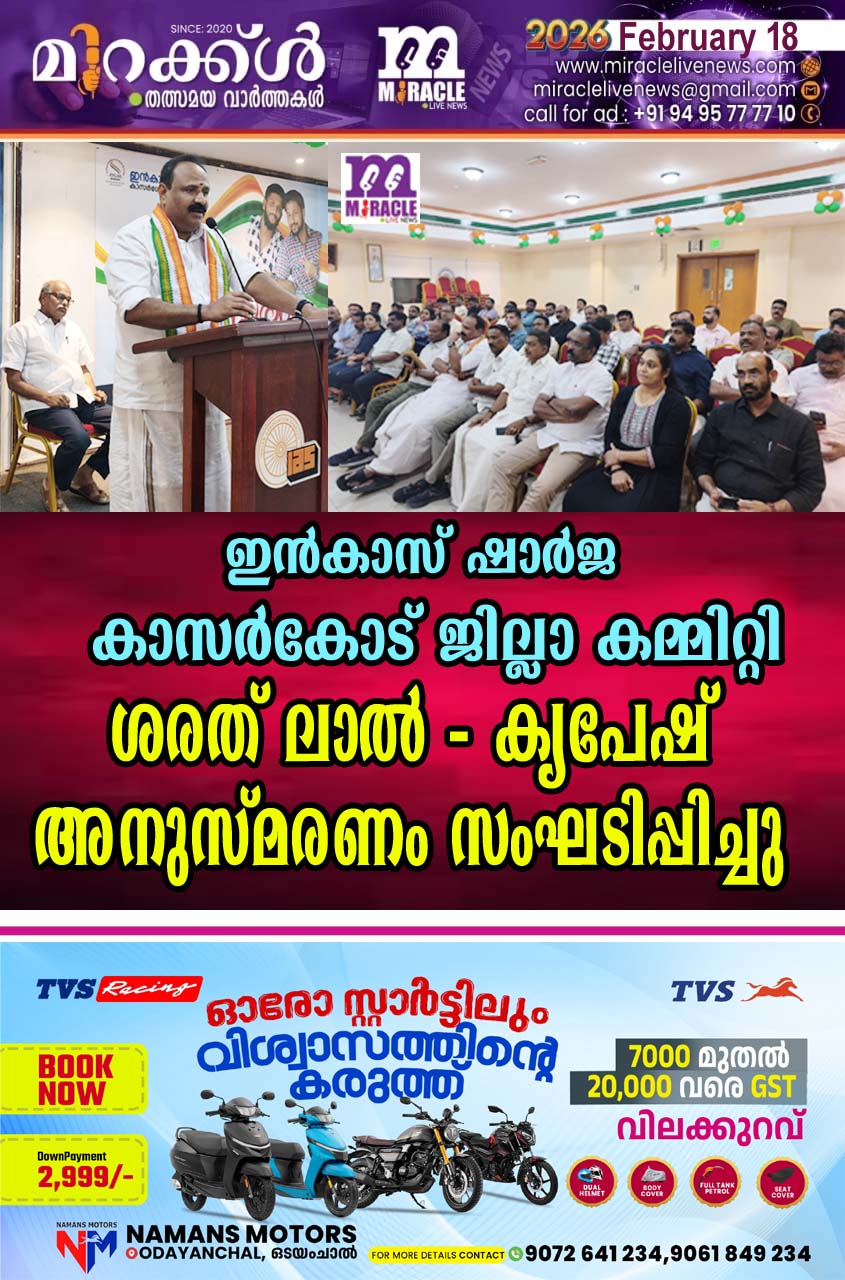 ഷാര്ജ: ഇന്കാസ് ഷാര്ജകാസര്കോട് ജില്ലാകമ്മറ്റിയുടെ നേതൃത്വത്തില് ധീരരക്തസാക്ഷിളായ കല്യോട്ടെ ശരത് ലാല്കൃപേഷ് ഏഴാമത് അനുസ്മരണദിനം ആചരിച്ചു. പ്രസ്ഥാനത്തിന് വേണ്ടി ജീവന്വെടിഞ്ഞ പ്രിയപ്പെട്ടവരുടെ ഓര്മ്മകള് അയവിറക്കാന് നിരവധി കോണ്ഗ്രസ്സ്പ്രവര്ത്തകര് ഷാര്ജ ഇന്ത്യന് അസോസിയേഷന് ഹാളിലേക്ക് ഒഴുകിയെത്തി. ഇന്കാസ് കാസര്കോട് ജില്ലാ ജന: സെക്രട്ടറി പവിത്രന് നിട്ടൂര് സ്വാഗതം പറഞ്ഞു.