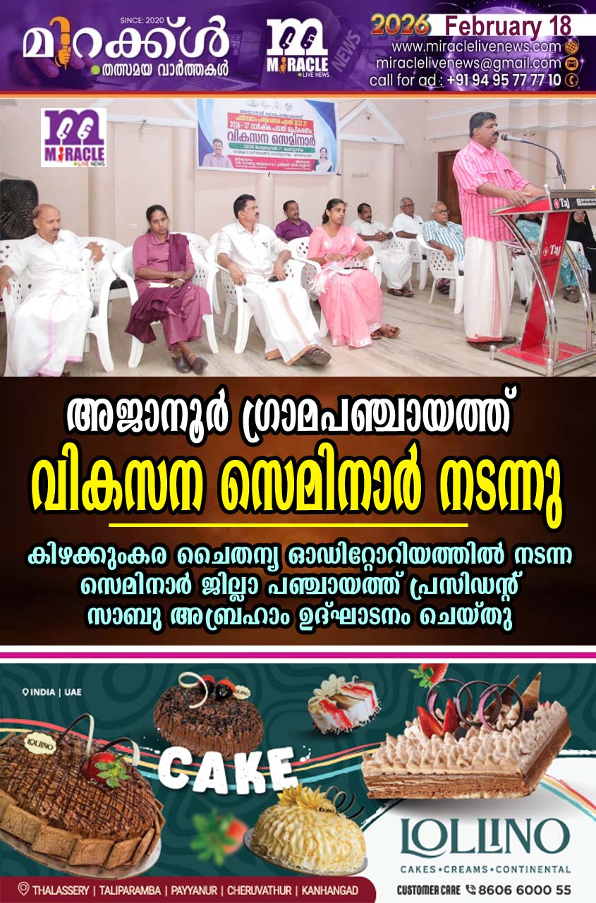 കാഞ്ഞങ്ങാട്: അജാനൂര് ഗ്രാമപഞ്ചായത്ത് പതിനാലാം പഞ്ചവത്സര പദ്ധതി 202227, വാര്ഷിക പദ്ധതി 2026 27 ഭാഗമായി വികസന സെമിനാര് നടന്നു. കിഴക്കുംകര ചൈതന്യ ഓഡിറ്റോറിയത്തില് നടന്ന വികസന സെമിനാര് ജില്ലാ പഞ്ചായത്ത് പ്രസിഡണ്ട് സാബു അബ്രഹാം ഉദ്ഘാടനം ചെയ്തു. അജാനൂര് ഗ്രാമപഞ്ചായത്ത് പ്രസിഡണ്ട് വി. വി. തുളസി അധ്യക്ഷത വഹിച്ചു. അജാനൂര് ഗ്രാമപഞ്ചായത്ത് വികസനകാര്യ സ്റ്റാന്ഡിങ് കമ്മിറ്റി ചെയര്പേഴ്സണ് ടി.വി. കാവ്യ കരട് രേഖ അവതരണം നടത്തി. ജില്ലാ പഞ്ചായത്ത് വൈസ് പ്രസിഡണ്ട് കെ. കെ. സോയ, കാഞ്ഞങ്ങാട് ബ്ലോക്ക് പഞ്ചായത്ത് പ്രസിഡണ്ട് കെ. സുജാത, ജില്ലാ പഞ്ചായത്ത് മെമ്പര് കെ. സബീഷ്, അജാനൂര് ഗ്രാമപഞ്ചായത്ത് ക്ഷേമകാര്യ സ്റ്റാന്ഡിങ് കമ്മിറ്റി ചെയര്പേഴ്സണ് സി. കുഞ്ഞാമിന, വിദ്യാഭ്യാസ, ആരോഗ്യ സ്റ്റാന്ഡിങ് കമ്മിറ്റി ചെയര്മാന് എം. വി. രാഘവന്, ബ്ലോക്ക് പഞ്ചായത്ത് മെമ്പര്മാരായ പി. കെ. മഞ്ജിഷ,രതീഷ് വെള്ളംതട്ട, കെ. ബിന്ദു, പി. അബ്ദുള് കരീം, പൊതുപ്രവര്ത്തകരായ കാറ്റാടി കുമാരന്, ഗംഗാധരന് പള്ളിക്കാപ്പില്,,വി. രാധാകൃഷ്ണന്, ഹമീദ് ചേരക്കാടത്ത്, കെ. സി.മുഹമ്മദ് കുഞ്ഞി, പ്രസാദ് മിഥില എന്നിവര് സംസാരിച്ചു. അജാനൂര് ഗ്രാമപഞ്ചായത്ത് വൈസ് പ്രസിഡണ്ട് മൂലക്കണ്ടം പ്രഭാകരന് സ്വാഗതവും സെക്രട്ടറി എന്. വി. സുധീര് നന്ദിയും പറഞ്ഞു. തുടര്ന്ന് ചര്ച്ചയും ക്രോഡീകരണവും നടന്നു.