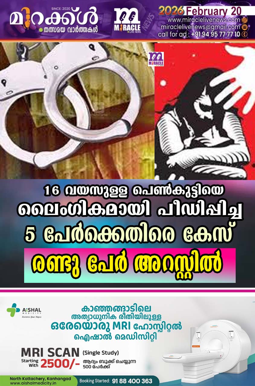 16 വയസുള്ള പെണ്‍കുട്ടിയെ ലൈംഗികമായി പീഡിപ്പിച്ച 5 പേര്‍ക്കെതിരെ കേസ്; രണ്ടു പേര്‍ അറസ്റ്റില്‍