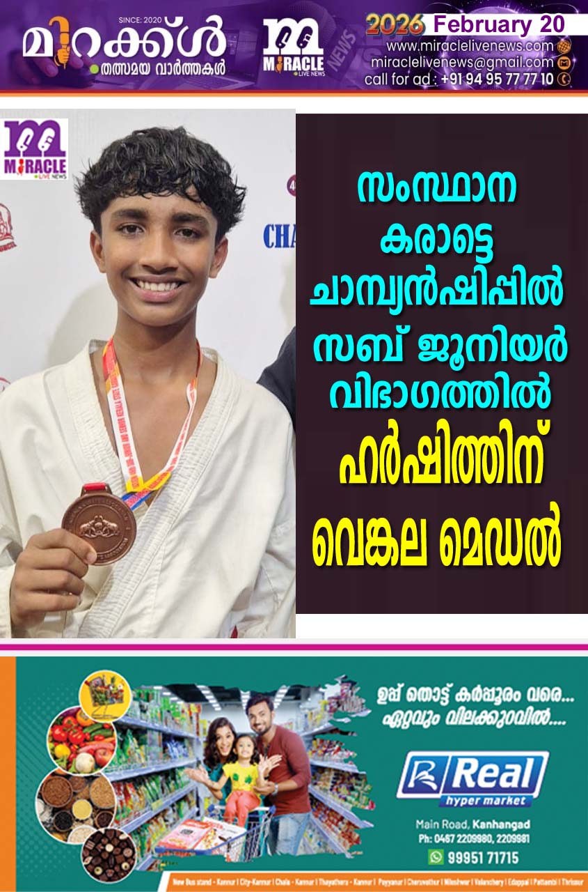 ഉദുമ: കേരള സ്പോര്ട്സ് കൗണ്സില് ഒളിമ്പിക്സ് അസോസിയേഷന് അംഗീകാരത്തില് തൃശ്ശൂരില് നടന്ന 46മത് കേരള സംസ്ഥാന കരാട്ടെ ചാമ്പ്യന്ഷിപ്പില് സബ് ജൂനിയര് വിഭാഗത്തില് വെങ്കല മെഡല് നേടി ഉദുമയിലെ ഹര്ഷിത്ത് എ. അച്ചേരി ഹര്ഷസരോവറിലെ പുരുഷോത്തമന്റെയും രജിതയുടെയും മകനാണ്. ഉദുമ ഗവ. ഹയര് സെക്കന്ററി സ്കൂളിലെ ഏഴാം തരം വിദ്യാര്ത്ഥിയാണ്.