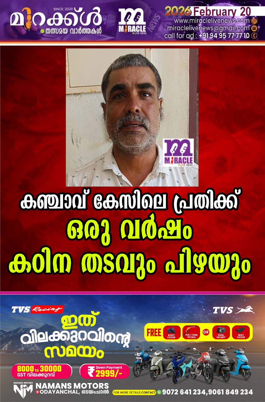 കടമ്പാര് പത്തോടിയിലെ അബ്ദുള്റഹ്മാ (49) നെയാണ് കാസര്കോട് അഡീഷണല് ഡിസ്ട്രിക്റ്റ് ആന്റ് സെഷന്സ് കോടതി (രണ്ട് )ജഡ്ജ് രാമു രമേഷ് ചന്ദ്രഭാനു ശിക്ഷ വിധിച്ചത് . പിഴയടച്ചില്ലെങ്കില് രണ്ട് മാസം കൂടി അധിക തടവും വിധിച്ചു.കുമ്പള പോലീസ് സ്റ്റേഷന് പരിധിയിലെ അടുത്ത എന്ന സ്ഥലത്ത് ഇച്ചിലംകോട് ജംഗ്ഷനില് വാഹന പരിശോധന നടത്തുന്നതിനിടെയാണ് കെ .എല്.14 വൈ 5620 നമ്പര് സ്കൂട്ടിയില് 1.670 കിലോ കഞ്ചാവുമായി