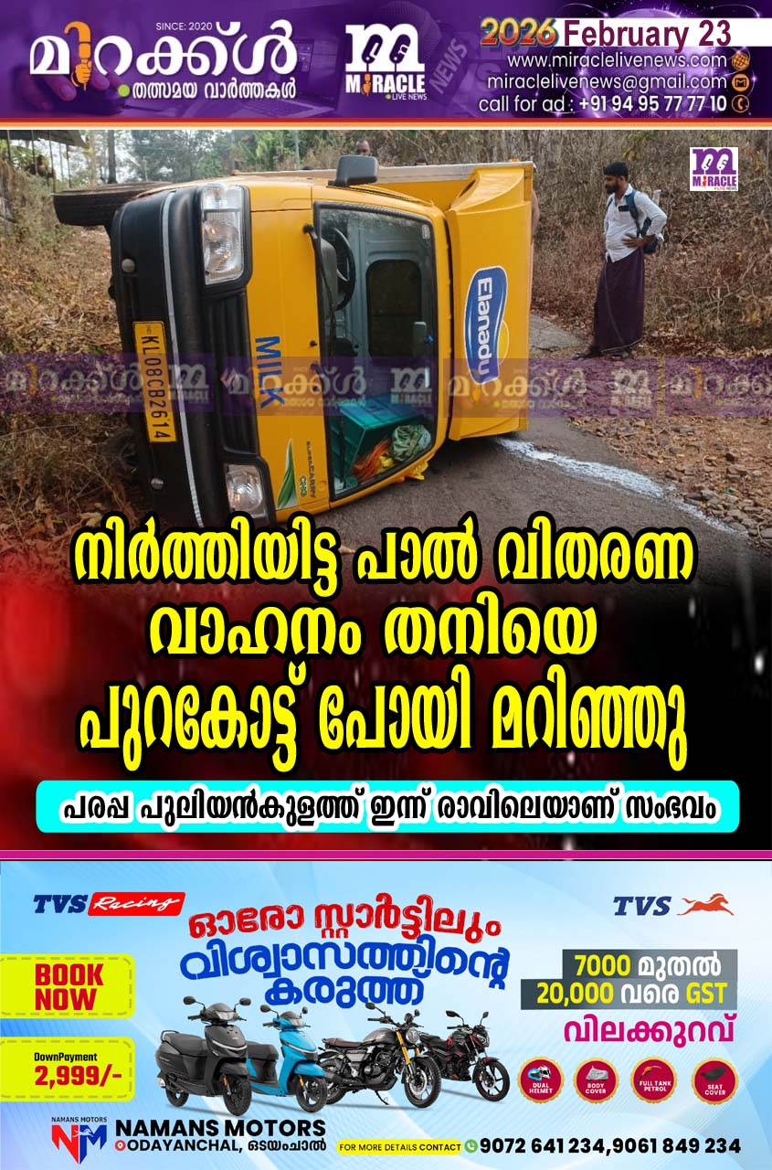 പരപ്പ: നിര്ത്തിയിട്ട പാല് വിതരണ വാഹനം തനിയെ പുറകോട്ട് പോയി മറിഞ്ഞു. പുലിയന്കുളത്ത് ഇന്ന് രാവിലെയാണ് സംഭവം. എളനാട് പാല് വിതരണം ചെയ്യുന്ന കെഎല് 08 സി.ബി. 2614 നമ്പര് വാഹനമാണ് അപകടത്തില്പ്പെട്ടത്. ഡ്രൈവര് സമീപത്തെ കടയില് പാല് വിതരണം ചെയ്യുന്നതിനിടയില് വാഹനം തനിയെ പിറകോട്ട് പോയാണ് മറിഞ്ഞത്. ലിറ്റര് കണക്കിന് പാല് റോഡില് ഒഴുകിപ്പോയി.