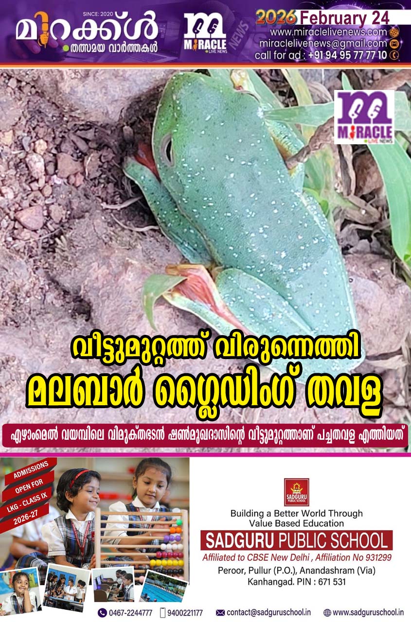 വീട്ടുമുറ്റത്ത് വിരുന്നെത്തി പച്ചത്തവള. മലബാര്‍ ഗ്ലൈഡിംഗ് തവള (റാക്കോഫോറസ് മലബാറിക്കസ്)എന്നയിനം തവളയാണ്. പശ്ചിമഘട്ടത്തിലെ മഴക്കാടുകളില്‍ കാണപ്പെടുന്ന, മരങ്ങളില്‍ നിന്ന് മരങ്ങളിലേക്ക് വിരലുകള്‍ക്കിടയിലെ ചര്‍മ്മം ഉപയോഗിച്ച് പാരച്യൂട്ടുപോലെ തെന്നിനീങ്ങാന്‍ കഴിവുള്ള അപൂര്‍വയിനം തവളയാണ് മലബാര്‍ ഗ്ലൈഡിംഗ് ഫ്രോഗ്പച്ചിലപ്പാറാന്‍ എന്നും വിളിക്കുന്ന ഇവ 1012 മീറ്റര്‍ വരെ ദൂരം വായുവില്‍ സഞ്ചരിക്കാറുണ്ട്.നല്ല തിളക്കമുള്ള പച്ചനിറം, ഓറഞ്ച് അല്ലെങ്കില്‍ ചുവപ്പ് കലര്‍ന്ന മഞ്ഞ വിരല്‍ച്ചര്‍മ്മങ്ങള്‍.
