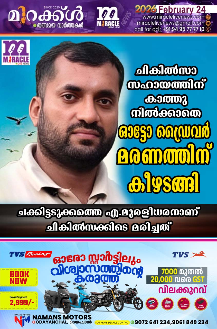 ഒടയംചാല്: വൃക്കരോഗം ബാധിച്ചു ചികിത്സയില് കഴിയുന്ന യുവാവിന്റെ രക്ഷിക്കാന് നാട്ടുകാരുടെ നേതൃത്വ ത്തില് ചികില്സാ സഹായം സ്വരൂപിച്ചെങ്കിലും ഏറ്റുവാങ്ങാതെ ഓട്ടോ ഡ്രൈവറായ യുവാവ് മരണത്തിന് കീഴടങ്ങി.