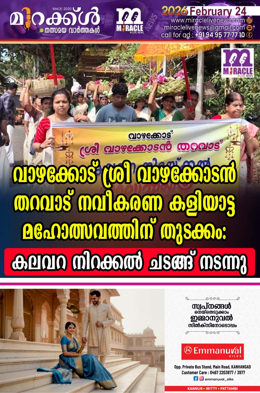 മാവുങ്കാല് : വാഴക്കോട് ശ്രീ വാഴക്കോടന് തറവാട് നവീകരണ കലശാഭിഷേകത്തിനും, കളിയാട്ട മഹോത്സവവത്തിനും ഭക്തിനിര്ഭരമായ തുടക്കം. ഇന്ന് രാവിലെ കല്യാണത്ത് നിന്നും തറവാട് അംഗങ്ങളുടെയും കുടുംബാംഗങ്ങളുടെയും നേതൃത്വത്തില് കലവറ ഘോഷയാത്ര നടന്നു. വൈകിട്ട് 5ന് ആചാര്യ വരവേല്പ്പ്.തുടര്ന്ന് മേല്മാട് സമര്പ്പണം ഇരവില് ഐ കെ കേശവ തന്ത്രി നിര്വഹിക്കും.നാളെ രാവിലെ മുതല് വിവിധ പൂജാദി കര്മ്മങ്ങള്.ഉച്ചയ്ക്ക് 12 മണിക്ക് ആദരിക്കല് ചടങ്ങ്.26 ന് രാവിലെ 6 ന് അരി ത്രാവല്.രാത്രി തെയ്യം കൂടല്,10 മണിക്ക് വിഷ്ണുമൂര്ത്തിയുടെയും പടിഞ്ഞാറ്റ ചാമുണ്ഡിയുടെയും കുളിച്ചേറ്റം തുടര്ന്ന് അന്നദാനം.രാത്രി 12 മണിക്ക് കാര്ന്നോന് തെയ്യത്തിന്റെ പുറപ്പാട്,പുലര്ച്ചെ രണ്ടുമണിക്ക് പൊട്ടന് തെയ്യത്തിന്റെ പുറപ്പാട്. 27 ന് രാവിലെ 11 മണിക്ക് രക്തചാമുണ്ഡി അമ്മയുടെ പുറപ്പാട് തുടര്ന്ന് അന്നദാനം.ഒരു മണിക്ക് വിഷ്ണുമൂര്ത്തിയുടെ പുറപ്പാട് തുടര്ന്ന് പടിഞ്ഞാറ്റ ചാമുണ്ഡി അമ്മയുടെയും ഗുളികന് തെയ്യത്തിന്റെയും പുറപ്പാട് ശേഷം വിളക്കിലരിയോടെ കളിയാട്ട മഹോത്സവങ്ങള്ക്ക് പരിസമാപ്തിയാവും