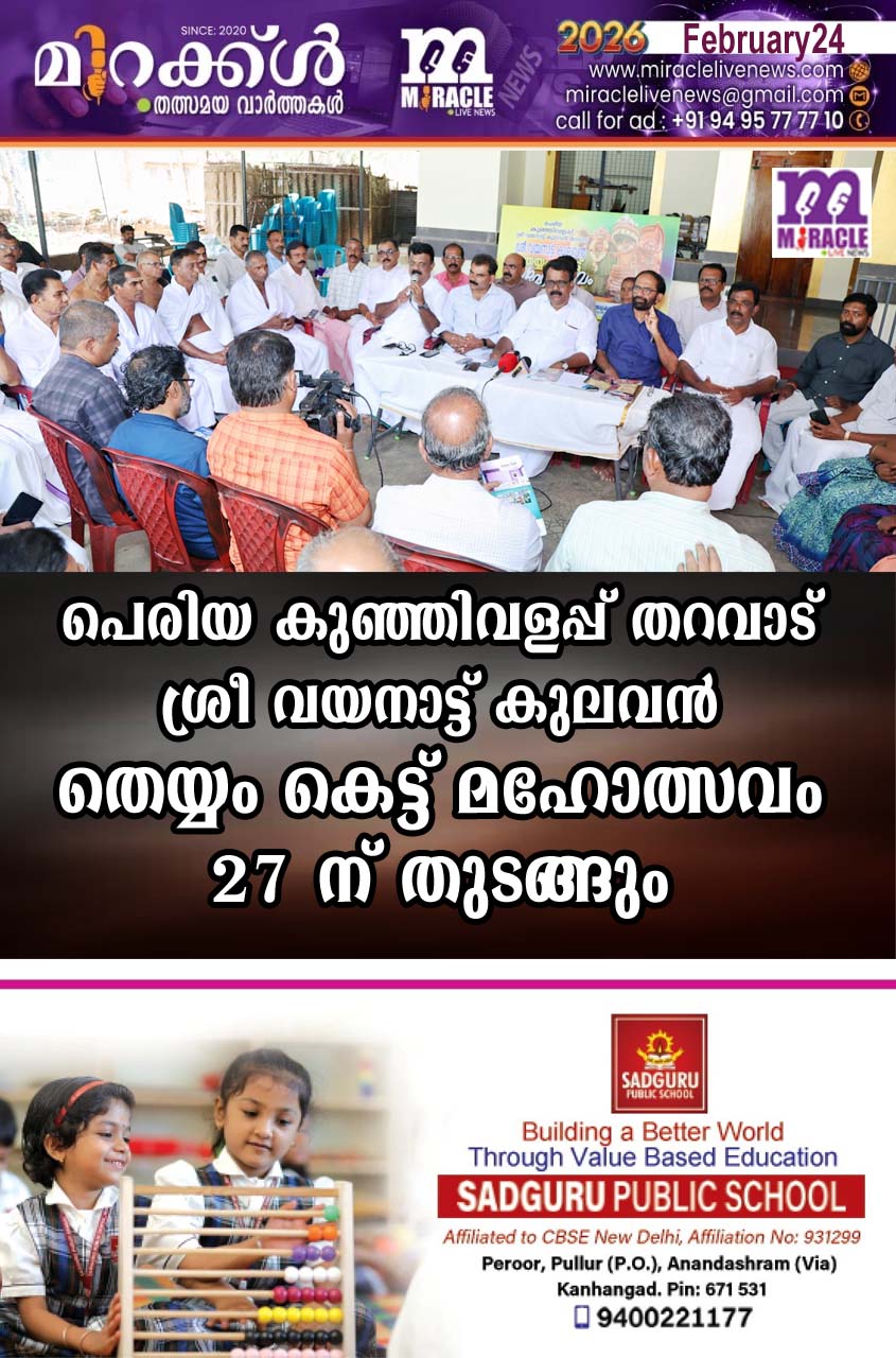 പെരിയ :പെരിയ കുഞ്ഞിവളപ്പ് തറവാട് വയനാട്ട് കുലവന്‍ തെയ്യം കെട്ട് മഹോത്സവം ഫെബ്രുവരി 27മുതല്‍ മാര്‍ച്ച് 1വരെ തീയ്യതികളില്‍ നടക്കുമെന്ന് ആഘോഷ കമ്മിറ്റി ഭാരവാഹികള്‍ വാര്‍ത്ത സമ്മേളനത്തില്‍ അറിയിച്ചു. 27ന് രാവിലെ 10.49ന് കലവറ നിറയ്ക്കല്‍. ഉച്ചക്ക് 12ന് അന്ന പ്രസാദം. വൈകിട്ട് 7ന് കൈവീത്. വയനാട്ട് കുലവന്‍ തെയ്യം കൂടല്‍ തോറ്റം, തുടര്‍ന്ന് തറവാട് തെയ്യം കൂടല്‍. വിഷ്ണുമൂര്‍ത്തി, പൊട്ടന്‍ തെയ്യം, പന്നിക്കുളത്ത് ചാമുണ്ഡി തോറ്റങ്ങളും ഉണ്ടാകും. 28ന് പുലര്‍ച്ചെ പൊട്ടന്‍ തെയ്യം, പന്നിക്കുളത്ത് ചാമുണ്ഡി. രാവിലെ 11ന് വിഷ്ണു മൂര്‍ത്തി. വൈകിട്ട് 4ന് കാര്‍ന്നോന്‍ തെയ്യത്തിന്റെ വെള്ളാട്ടം. 6 ന് കോരച്ചന്‍ തെയ്യത്തിന്റെ വെള്ളാട്ടം, രാത്രി 9 ന് കണ്ടനാര്‍ കേളന്‍ തെയ്യത്തിന്റെ വെള്ളാട്ടവും ബപ്പിടല്‍ ചടങ്ങും. 11ന് വിഷ്ണു മൂര്‍ത്തിയുടെ തോറ്റം. 12ന് വയനാട്ട് കുലവന്‍ തെയ്യത്തിന്റെ വെള്ളാട്ടം. മാര്‍ച്ച് 1ന് രാവിലെ 9ന് കാര്‍ന്നോന്‍ തെയ്യം, 10ന് കോരച്ചന്‍ തെയ്യം, 11ന് കണ്ടനാര്‍ കേളന്‍ തെയ്യം, ഉച്ചക്ക് 12ന് ശേഷം അന്ന പ്രസാദം. വൈകിട്ട് 3ന് വയനാട്ട് കുലവന്‍ തെയ്യത്തിന്റെ പുറപ്പാടും ചൂട്ടൊപ്പിക്കല്‍ ചടങ്ങും. തുടര്‍ന്ന് വിഷ്ണു മൂര്‍ത്തിയുടെ പുറപ്പാട്, പെരിയ തറവാട്ടിലേക്ക് തെയ്യങ്ങളുടെ എഴുന്നള്ളത്തും തിരിച്ചെഴുന്നള്ളത്തും. രാത്രി 10ന് മറ പിളര്‍ക്കല്‍, തുടര്‍ന്ന് കൈ വീത് ചടങ്ങോടെ ഉത്സവം സമാപിക്കും.
