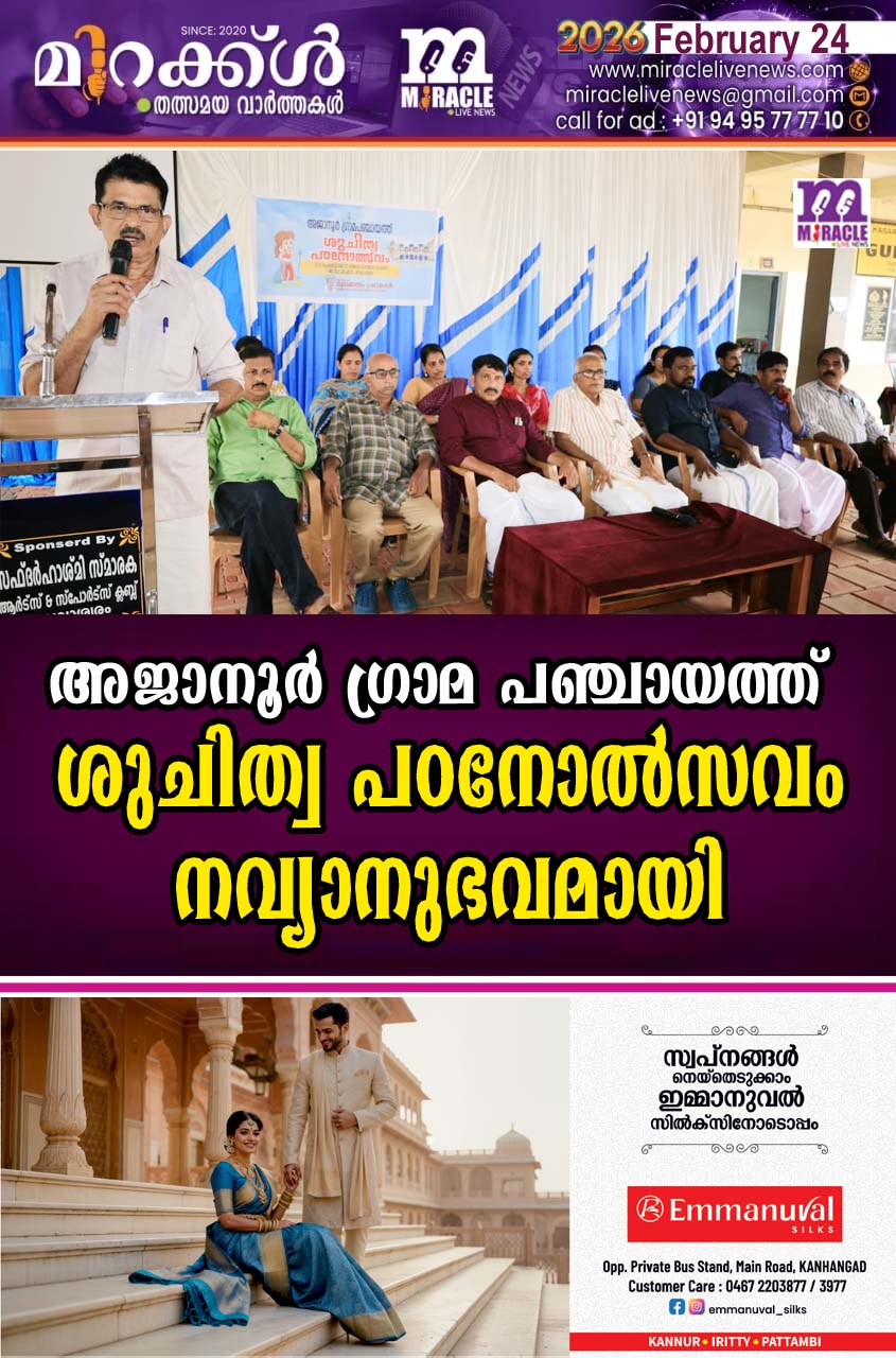 വേലാശ്വരം: അജാനൂര് ഗ്രാമ പഞ്ചായത്ത്,തദ്ദേശ സ്വയംഭരണ വകുപ്പ് എന്നിവ വിദ്യാഭ്യാസവകുപ്പുമായി ചേര്ന്ന് ജില്ലാ ശുചിത്വമിഷന്റെ സഹകരണത്തോടെ നടപ്പിലാക്കി വരുന്ന ശുചിത്വ പഠനോല്സവവും ഇക്കോ സെന്സ് സ്കോളര്ഷിപ്പ് വിതതണവും വിദ്യാര്ത്ഥികള്ക്ക് നവ്യാനുഭവം പകര്ന്നു. വേലാശ്വരം ഗവ: യു.പി സ്കൂളില് വെച്ച് നടന്ന പരിപാടി അജാനൂര് ഗ്രാമ പഞ്ചായത്ത് വൈസ് പ്രസിഡണ്ട് മൂലക്കണ്ടം പ്രഭാകരന് ഉദ്ഘാടനം ചെയ്തു. ആരോഗ്യ വിദ്യാഭ്യാസ സ്റ്റാന്റിങ്ങ് കമിറ്റി ചെയര്മാന് എം.വി. രാഘവന് അധ്യക്ഷത വഹിച്ചു. വാര്ഡ് മെമ്പര് കെ.വി. സുകുമാരന്, ദീപ പ്രവീണ്, അജാ ന്നൂര് ഗ്രാമ പഞ്ചായത്ത് സെക്രട്ടറി എന്. എം സുധീര് വാര്ഡ് മെമ്പര് രതീഷ്,വേലാശ്വരം ഗവ യു .പി സ്കൂള് പി. ടി.എ പ്രസിഡണ്ട് പി.വിനോദ്, വി.ഇ ഒ ഇക്ബാല്, ശുചിത്വ മിഷന് ആര്.പിമാരായ പി.വല്സ രാജ് ആതിര എ.വി, എച്ച്.ഐ മാരായ വിനോദ്, അമിഷ, വേലാശ്വരം ഗവയു.പി സ്കൂള് സീനിയര് അസിസ്റ്റന്റ് കെ. ഉമാദേവി തുടങ്ങിയവര് ആശംസകള് നേര്ന്നു സംസാരിച്ചു. ശുചിത്വ മിഷന് ആര്.പി.