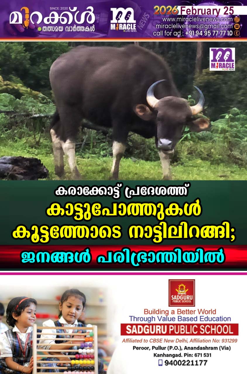 മടിക്കൈ :കാട്ടുപോത്തുകള് കൂട്ടത്തോടെ നാട്ടില് ഇറങ്ങിയത് ജനങ്ങളെ പരിഭ്രാന്തിയിലാഴ്ത്തി. കാരാക്കോട്, പനങ്ങാട് പ്രദേശത്തെ ജനവാസ കേന്ദ്രങ്ങളിലാണ് ഇന്ന് രാവിലെ പലരും മൂന്ന് കാട്ടുപോത്തുകളെ കണ്ടത്. കഴിഞ്ഞ ദിവസം കാട്ടിയെടുക്കം പ്രദേശങ്ങളില് കാട്ടുപോത്തിനെ കണ്ടിരുന്നു. നാട്ടുകാര് ഫോറസ്റ്റ് അധികതരെ വിവരമറിയിച്ചിട്ടുണ്ട്.