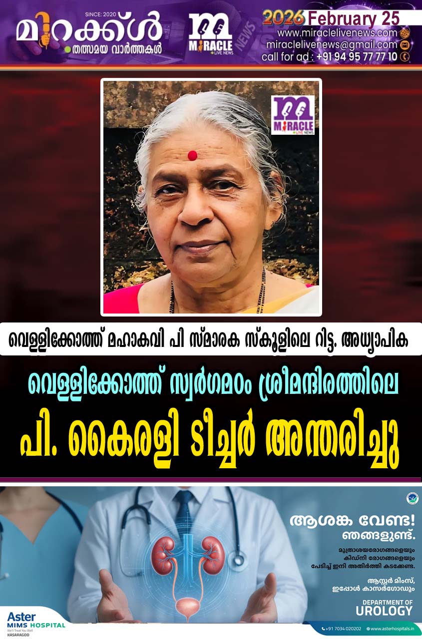 കാഞ്ഞങ്ങാട് : വെള്ളിക്കോത്ത് മഹാകവി പി സ്മാരക സ്കൂളിലെ റിട്ട. അധ്യാപിക വെള്ളിക്കോത്ത് സ്വര്ഗമഠം ശ്രീമന്ദിരത്തിലെ പി. കൈരളി ടീച്ചര് (81) അന്തരിച്ചു. സംസ്കാരം ഇന്ന് (25.02.2025 ബുധന്) വൈകിട്ട് 4 മണിക്ക് പുറവങ്കര തറവാട് ശ്മശാനത്തില്. ഭര്ത്താവ്: സി.കെ. കുഞ്ഞിക്കണ്ണന് നമ്പ്യാര് (റിട്ട. ഹെഡ് മാസ്റ്റര്, കുഞ്ഞിമംഗലം സ്കൂള്). മക്കള്: പി.ജ്യോതിലക്ഷ്മി (അധ്യാപിക, യുഎസ്എ), പി.ജയലക്ഷ്മി (അധ്യാപിക, എറണാകുളം), പി.ജിതേന്ദ്രന് (പ്രൊഡക്ട് മാനേജര്, ഇന്ഫോസിസ്, യുഎസ്എ), മരുമക്കള്: മനോജ് (ഐടി മാനേജര്, ബയോറാഡ്, യുഎസ്എ), പ്രമോദ് രാമന് (എഡിറ്റര്, മീഡിയാവണ് ചാനല്, കഥാകൃത്ത്), അശ്വിനി ജിതേന്ദ്രന് (പൂനെ). സഹോദരങ്ങള്: പരേതരായ പി.ഭാര്ഗവി അമ്മ, പി.സി. കുഞ്ഞിക്കുട്ടന് നായര്, പി. ഓമന അമ്മ, പി.സി. വേലായുധന് നായര്.