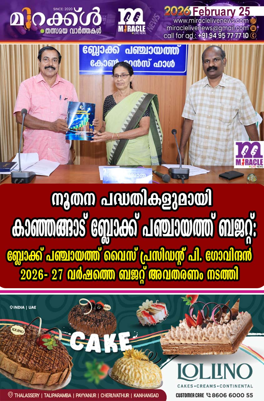 കാഞ്ഞങ്ങാട്: ന്യൂതന പദ്ധതികളിലൂടെ ജല സുരക്ഷ, ഭക്ഷ്യ ധാന്യ സുരക്ഷ, ധാന്യവിളകളുടെ പ്രോത്സാഹനം, ബ്ലോഗിന്റെ കീഴിലുള്ള പെരിയ സി. എച്ച്.സി സെന്റര് ഡയാലിസിസ് കേന്ദ്രം വിപുലീകരണം, ഓപ്പണ് ജിമ്മുകള് സൂമ്പ ഡാന്സ് പരിശീലനം, ഉന്നതിയിലെ കലാകാരന്മാര്ക്ക് ആധുനിക വാദ്യോപകരണ വിതരണം എന്നിവയ്ക്കെല്ലാം ഊന്നല് നല്കിക്കൊണ്ട് കാഞ്ഞങ്ങാട് ബ്ലോക്ക് പഞ്ചായത്തിന്റെ 202627 വര്ഷത്തെ ബജറ്റ് അവതരണം നടന്നു. 15 കോടി 5 ലക്ഷത്തി എഴുപത്തിനാലായിരത്തി 28 രൂപ വരവും 14 കോടി 46 ലക്ഷത്തി 5068 രൂപ ചെലവുമുള്ള ബജറ്റ് അവതരണം ബ്ലോക്ക് പഞ്ചായത്ത് വൈസ് പ്രസിഡന്റ് പി.ഗോവിന്ദനാണ് അവതരിപ്പിച്ചത്. കാഞ്ഞങ്ങാട് ബ്ലോക്ക് പഞ്ചായത്ത് പ്രസിഡന്റ് കെ. സുജാത വൈസ് പ്രസിഡന്റ് പി. ഗോവിന്ദന് നല്കിക്കൊണ്ട് ബജറ്റിന്റെ പ്രകാശന കര്മ്മം നിര്വഹിച്ചു. ബ്ലോക്ക് പഞ്ചായത്ത് സെക്രട്ടറി എസ്. ഹരികൃഷ്ണന്, വിവിധ ഗ്രാമപഞ്ചായത്ത് പ്രസിഡന്റുമാര്, ബ്ലോക്ക് സ്ഥിരം സമിതി അധ്യക്ഷന് മാര്, അംഗങ്ങള് ഉദ്യോഗസ്ഥര് എന്നിവര് സംസാരിച്ചു. പരിപാടിയില് വെച്ച് ബ്ലോക്ക് പഞ്ചായത്തില് നിന്നും വിരമിക്കുന്ന അസിസ്റ്റന്റ് എക്സിക്യൂട്ടീവ് എന്ജിനീയര് യു. വി.ഷാജിക്കുള്ള യാത്രയയപ്പ് ചടങ്ങില് ബ്ലോക്ക് പഞ്ചായത്ത് പ്രസിഡന്റ് കെ. സുജാത ഉപഹാരം കൈമാറി.