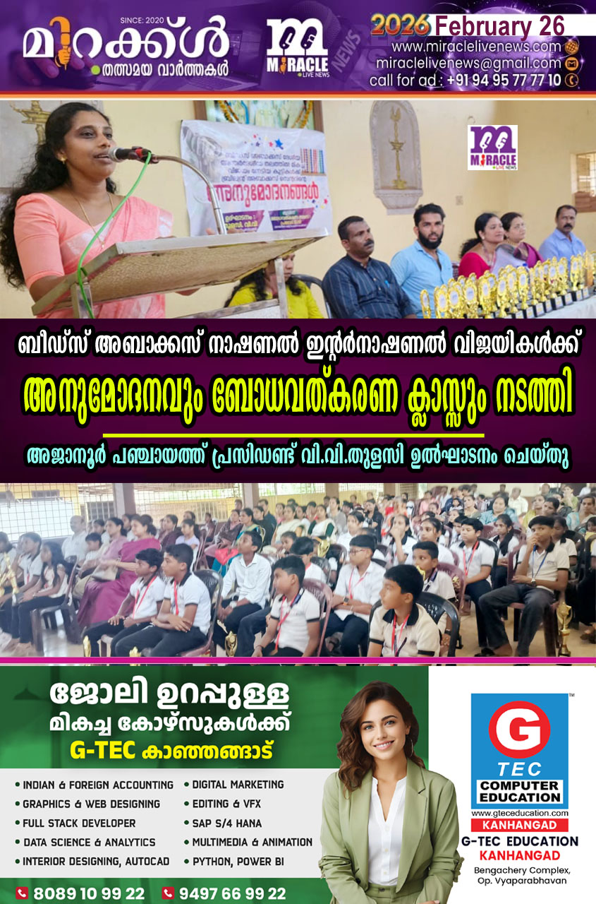 മാവുങ്കാല്: ബ്രില്യന്റ് അബാക്കസ് സെന്ററിന്റെ നേതൃത്വത്തില് നാഷണല് ഇന്റര്നാഷണല് ലെവല് വിജയികള്ക്ക് അനുമോദനവും ബോധവത്കരണ ക്ലാസ്സും നടത്തി.പുതിയകണ്ടം കേന്ദീകരിച്ച് മാവുങ്കാല് ശ്രീരാമ ക്ഷേത്രം ഓഡിറ്റോറിയത്തില് കുട്ടികളുടെയും രക്ഷിതാക്കളുടെയും വിജയഹ്ലാദ റാലി നടത്തി.