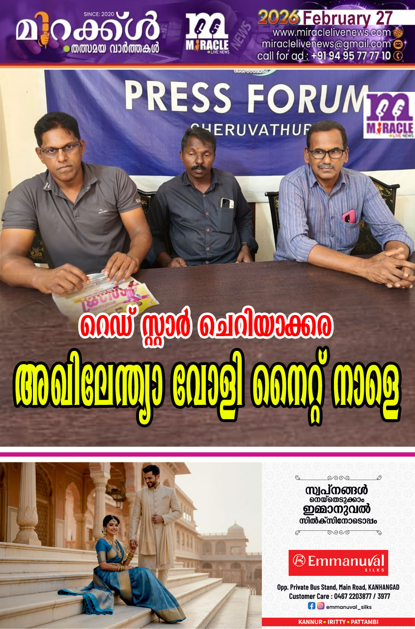 ചെറുവത്തൂര്: ചെറിയാക്കര റെഡ് സ്റ്റാര് ആര്ട്സ് ആന്റ് സ്പോര്ട്സ് ക്ലബ്ബിന്റെ ആഭിമുഖ്യത്തില് രണ്ടാമത് അഖിലേന്ത്യ വോളി നൈറ്റ് നാളെ നടക്കും. വൈകിട്ട് 7ന് എം രാജഗോപാലന് എംഎല്എ ഉദ്ഘാടനം ചെയ്യും. യൂണിവേഴ്സിറ്റി താരങ്ങളും സംസ്ഥാന, ദേശീയ താരങ്ങളും അണിനിരക്കുന്ന ആറ് പ്രാദേശികള് ടീമുകളാണ് വോളി നൈറ്റില് മത്സരിക്കുന്നത്. ജോളി കാനായി, യങ്സ്റ്റാര് മാതമംഗലം, ജനശക്തി ആലംന്തട്ട, സി. സി ഒടയംചാല്, സ്റ്റാര് ബോയ്സ് പാലോത്ത്, യൂത്ത് ഫെയ്സ് മാടത്തടുക്ക സ്പോണ്സര് ചെയ്യുന്ന മുംബൈ സ്പൈക്കേഴ്സ് എന്നീ ടീമുകളാണ് വോളി ടൂര്ണമെന്റില് അണിനിരക്കുന്നത്. ഒന്നാം സ്ഥാനം നേടുന്ന ടീമിന് 25,000 രൂപയും ട്രോഫിയും രണ്ടാം സ്ഥാനം നേടുന്ന ടീമിന് 20,000 രൂപയും ട്രോഫിയും സമ്മാനമായി നല്കും. 600 പേര്ക്ക് ഇരുന്നു കളി കാണുന്ന ഗാലറിയും 300 പേര്ക്ക് ഇരിക്കാനായി കസേരകളും സംഘാടക സമിതി ഒരുക്കിയിട്ടുണ്ട്. വോളി ടൂര്ണമെന്റില് നിന്ന് ലഭിക്കുന്ന വരുമാനം റെഡ് സ്റ്റാര് ക്ലബ്ബിന് കെട്ടിടം പണിയുന്നതിനും കളിസ്ഥലം നിര്മ്മിക്കുന്നതിന് വേണ്ടി ഉപയോഗിക്കുമെന്ന് ഭാരവാഹികളായ ടി.വി മധു, പി ബിജു, കെ. കെ തമ്പാന് എന്നിവര് വാര്ത്ത സമ്മേളനത്തില് അറിയിച്ചു.