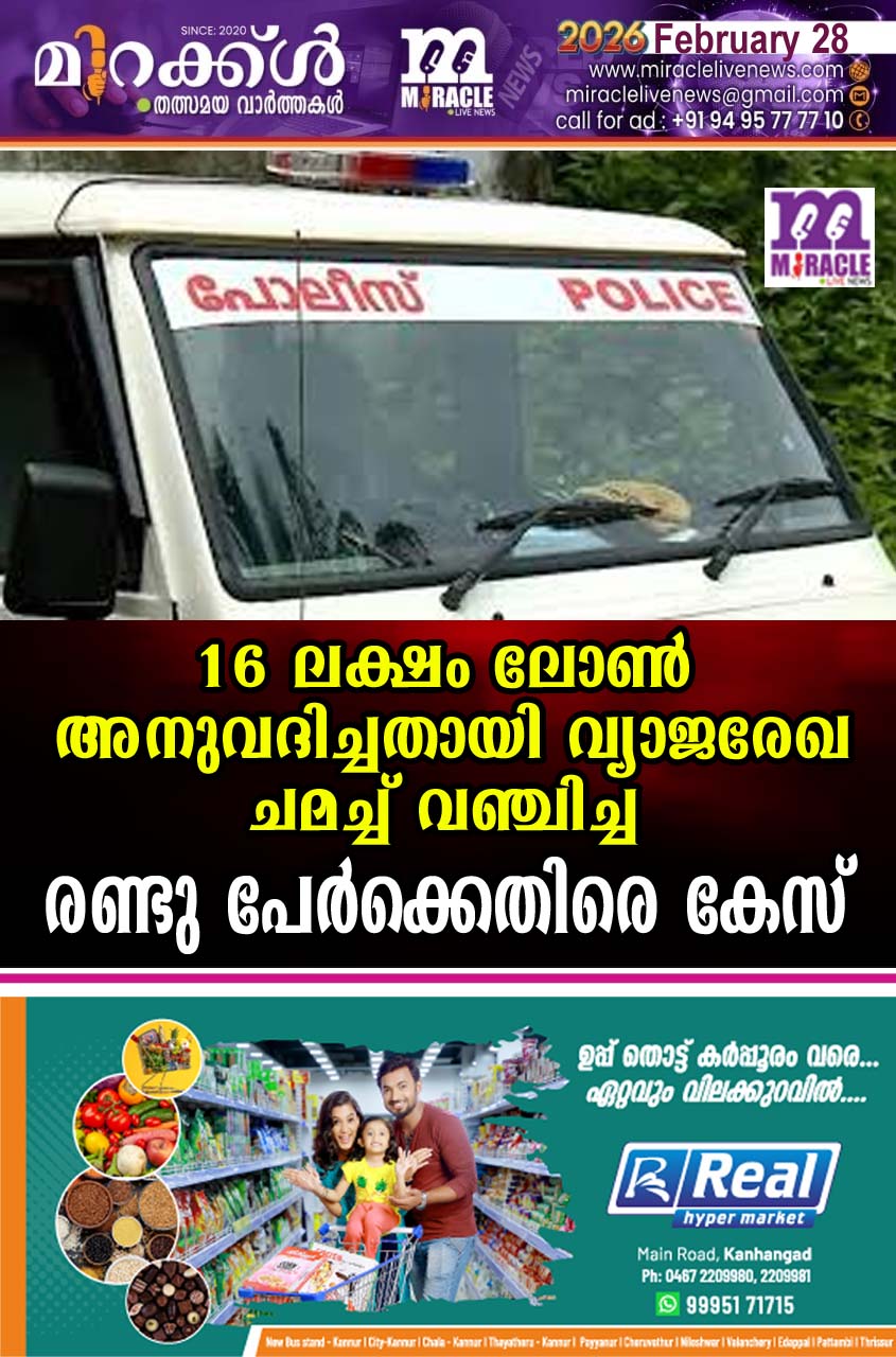 രാജപുരം: 16 ലക്ഷം രൂപയുടെ ലോണ് അനുവദിച്ചു തരാമെന്ന് വിശ്വസിപ്പിച്ച് യുവാവില് നിന്നും പ്രൊസസ്സിങ്ങ് ഫീസായി 72,500 രൂപ കൈപറ്റിയ ശേഷം 16 ലക്ഷം പാസായതായ വ്യാജ രേഖകള് നല്കി യുവാവിനെ വഞ്ചിച്ച സ്വകാര്യ ധനകാര്യസ്ഥാപനത്തിലെ രണ്ടു പേര്ക്കെതിരെ പരാതിയില് പോലീസ് കേസെടുത്തു. കള്ളാര് പതിനെട്ടാം മൈലിലെ കൊച്ചുക്കുന്നേല് ഹൗസില് അനീഷ് തോമസിന്റെ പരാതിയിലാണ് കോട്ടയം ആസ്ഥാനമായി പ്രവര്ത്തിക്കുന്ന ധനധ ഫണ്ട്സ് സ്ഥാപന ഉടമകളായ അശ്വിന് അജിത്ത്, അനൂപ് എന്നിവര്ക്കെതിരെ പോലീസ് കേസെടുത്തത്. 2025 നവംബര് 4 ന് ഉപരിപഠനത്തിനായി യു.കെ.യിലേക്ക് പോകാന് പരാതിക്കാരന് 16 ലക്ഷം രൂപ ലോണിന് പ്രതികളെ സമീപിച്ചത്. ലോണ് പാസ്സാക്കുന്നതിലേക്ക് പ്രൊസസ്സിങ്ങ് ചാര്ജ്ജായി 72 500 രൂപ വാങ്ങിയ പ്രതികള് രേഖകള് വ്യാജമായി നിര്മ്മിച്ച് 16 ലക്ഷം ഒറിജിനലാണെന്ന് തെറ്റിദ്ധരിപ്പിച്ച് നല്കുകയും അത് വിസക്കായി യു.കെ. ഗവര്മെണ്ടില് സമര്പ്പിച്ചത് വഴി വിസ കാന്സല് ചെയ്ത് 10 വര്ഷത്തേക്ക് വിദേശത്തേക്ക് പോകാന് സാധിക്കാതെ വഞ്ചിച്ചുവെന്ന പരാതിയിലാണ് കേസെടുത്തത്.
