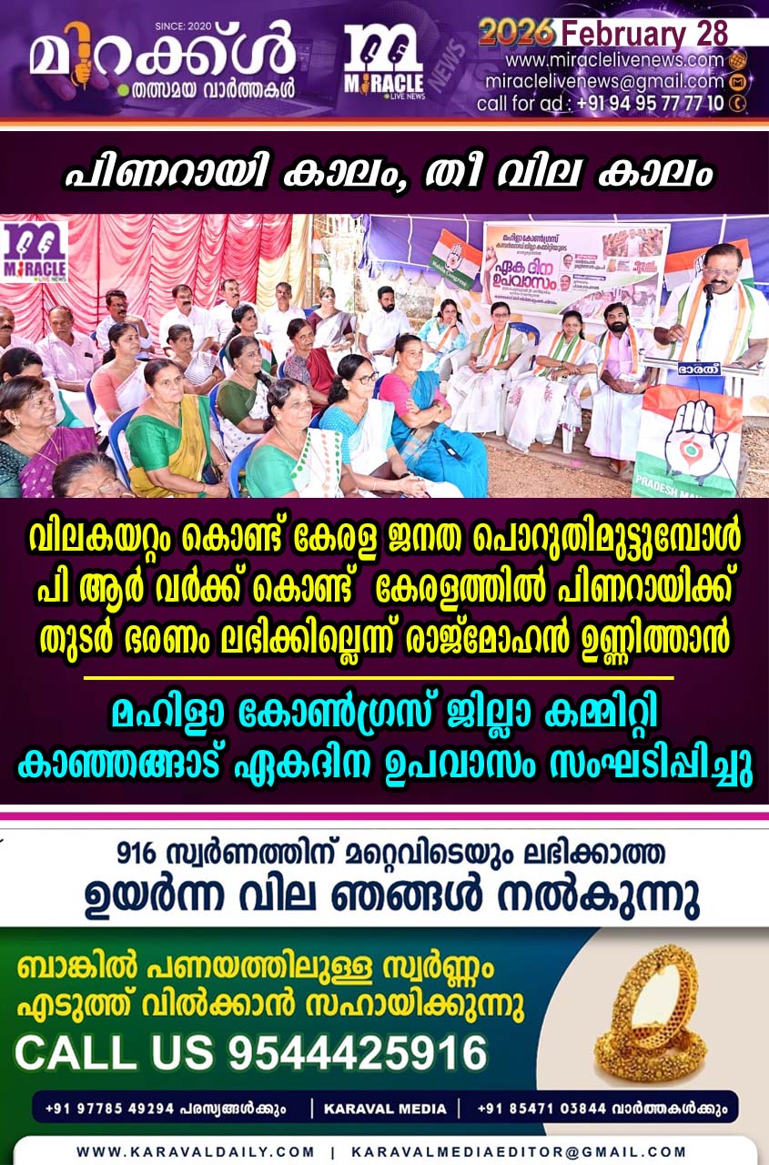 കാഞ്ഞങ്ങാട്: വിലകയറ്റം കൊണ്ട് കേരള ജനത പൊറുതിമുട്ടി ജീവികുമ്പോള് പി.ആര് വര്ക്ക് കൊണ്ട് തുടര് ഭരണം നേടാമെന്നത് പിണറായിയുടെ വ്യാമോഹം മാത്രമെന്ന് കാഞ്ഞങ്ങാട് മിനി സിവില് സ്റ്റേഷന് പരിസരത്ത് മഹിളാ കോണ്ഗ്രസ് ജില്ലാ കമ്മിറ്റിയുടെ നേതൃത്വത്തില് നടക്കുന്ന ഏകദിന ഉപവാസം ഉദ്ഘാടനം ചെയ്തു കൊണ്ട് പറഞ്ഞു.