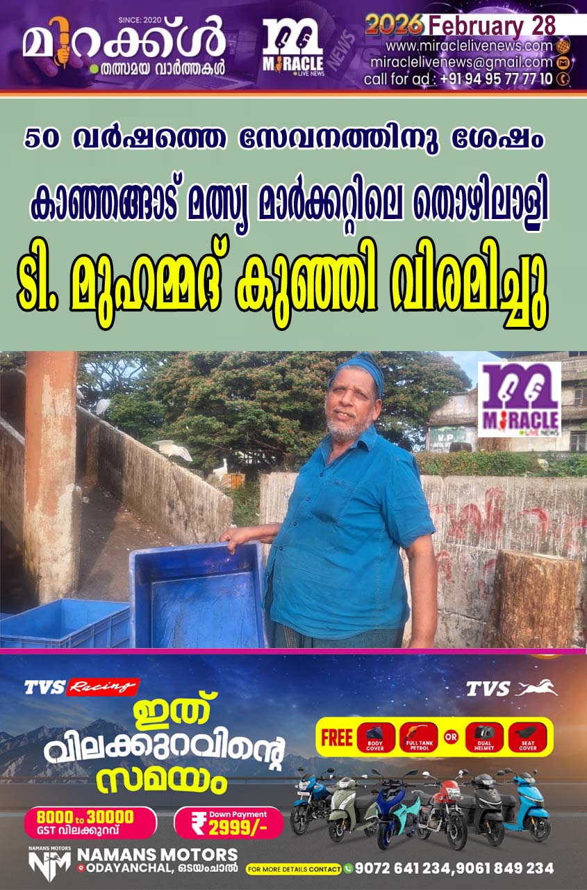 കാഞ്ഞങ്ങാട്: 50 വര്ഷത്തെ സേവനത്തിനുശേഷം കാഞ്ഞങ്ങാട് മത്സ്യ മാര്ക്കറ്റിലെ എസ് ടി യു തൊഴിലാളി ടി. മുഹമ്മദ് കുഞ്ഞി മത്സ്യ മാര്ക്കറ്റിലെ ജോലിയില് നിന്നും ഇന്ന് വിരമിച്ചു. അതിരാവിലെ അദ്ദേഹത്തിന്റെ വീട്ടില് നിന്നും കുടുംബം പുലര്ത്തുന്നതിന് വേണ്ടി നടന്നും സൈക്കിള് ചവിട്ടിയും കാഞ്ഞങ്ങാട് മാര്ക്കറ്റില് എത്തുകയും കാഞ്ഞങ്ങാട് റെയില്വേ സ്റ്റേഷനില് നിന്നും ട്രെയിന് മാര്ഗ്ഗവും പള്ളിക്കര കടപ്പുറത്ത് നിന്നും 80 കിലോയോളം വരുന്ന മത്സ്യ കെട്ടുകള് മാര്ക്കറ്റില് തല ചുമടായി എത്തിക്കുകയും ചെയ്യുന്ന ഇദ്ദേഹം ഇന്നുള്ള തൊഴിലാളികള്ക്ക് ഒരു മാതൃകയാണ്.