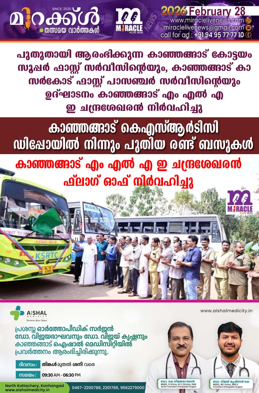 കാഞ്ഞങ്ങാട്: പുതുതായി ആരംഭിക്കുന്ന കാഞ്ഞങ്ങാട് കോട്ടയം സൂപ്പര് ഫാസ്റ്റ് സര്വീസിന്റെയും, കാഞ്ഞങ്ങാട് കാസര്കോട് ഫാസ്റ്റ് പാസഞ്ചര് സര്വീസിന്റെയും ഉദ്ഘാടനം കാഞ്ഞങ്ങാട് എം എല് എ ഇ ചന്ദ്രശേഖരന് നിര്വഹിച്ചു. കാഞ്ഞങ്ങാട് ഡിപ്പോയില് നിന്നും പുതിയ രണ്ട് ട്രിപ്പുകള് ബന്തടുക്ക, പരപ്പ റൂട്ടുകളിലായി ആരംഭിച്ചു. വൈകിട്ട് 7 മണിക്ക് കോട്ടയം സൂപ്പര്ഫാസ്റ്റ് സര്വീസ് കാഞ്ഞങ്ങാട് നിന്ന് ആരംഭിക്കും. ചന്ദ്രഗിരിപ്പാലം വഴി ഫാസ്റ്റ് പാസഞ്ചര് ലിങ്ക് ബസ് നിലവില് കാഞ്ഞങ്ങാട്, പൂച്ചക്കാട്, ബേക്കല് ഫോര്ട്ട്, മേല്പറമ്പ, കാസര്കോട് എന്നിവിടങ്ങളിലാണ് സ്റ്റോപ്പുകള്. കൂടാതെ കാഞ്ഞങ്ങാട് നിന്നും പുതിയ രണ്ടു ട്രിപ്പുകള് കൂടി ആരംഭിച്ചു. രാത്രി 7:15 ന് ഒടയംചാല്, കോളിച്ചാല് വഴി ബന്തടുക്കയിലേക്കും തിരിച്ച് പുലര്ച്ചെ 4:30 ന് ബന്തടുക്കയില് നിന്നും കുറ്റിക്കോല്, ചുള്ളിക്കര വഴി കാഞ്ഞങ്ങാടേക്ക് പരശുറാം എക്സ്പ്രസിന് കണക്ഷന് കിട്ടുന്ന വിധത്തിലുമാണ് സര്വ്വീസ് ക്രമീകരിച്ചിരിക്കുന്നത്. രാവിലെ 11:45 ന് കാഞ്ഞങ്ങാട് നിന്നും ജില്ലാ ആശുപത്രി, കാഞ്ഞിരപ്പൊയില്, അടുക്കം വഴി പരപ്പയിലേക്കും തിരിച്ച് ഉച്ചയ്ക്ക് 1:20 ന് പരപ്പയില് നിന്നും ബിരിക്കുളം, നെല്ലിയടുക്കം, നീലേശ്വരം, ചന്ദ്രഗിരിപ്പാലം വഴി കാസര്കോടേക്കുമാണ് സര്വ്വീസ് ഉണ്ടാവുക. കാഞ്ഞങ്ങാട് ഡിപ്പോയില് വച്ച് നടന്ന ചടങ്ങില് അസിസ്റ്റന്റ് ട്രാന്സ്പോര്ട്ട് ഓഫീസര് ആല്വിന് ടി സേവ്യര് അധ്യക്ഷനായിരുന്നു. സൂപ്രണ്ട് സരിത കെ, വിവിധ യൂണിയന് പ്രതിനിധികള്, ജീവനക്കാര് എന്നിവര് സംബന്ധിച്ചു.
