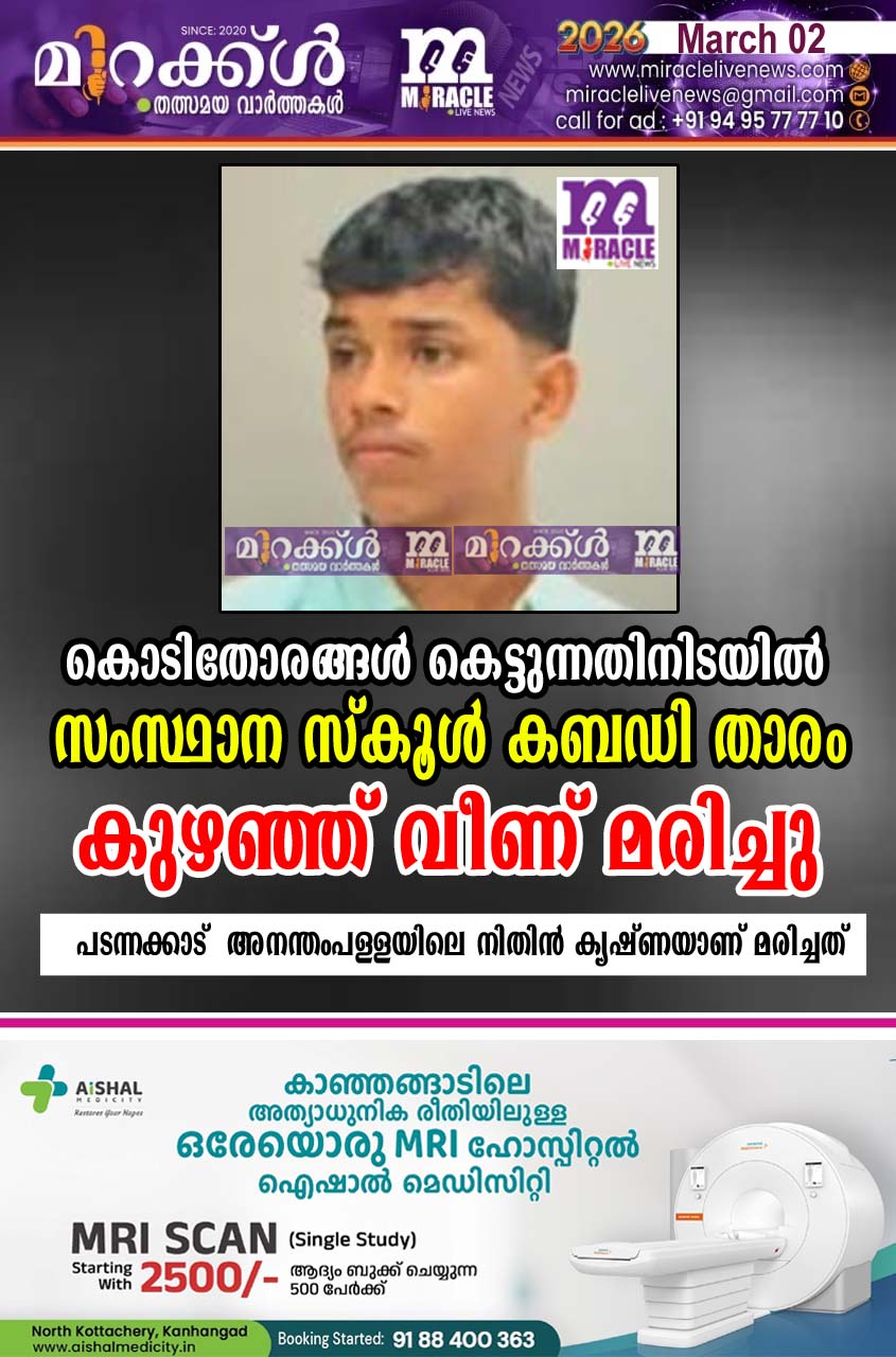 പടന്നക്കാട്: കബഡി ടൂര്ണമെന്റിന്റെ ഭാഗമായി കൊടിതോരങ്ങള് കെട്ടുന്നതിനിടയില് വിദ്യാര്ത്ഥി കുഴഞ്ഞ് വീണ് മരിച്ചു. സംസ്ഥാന സ്കൂള് കബഡി താരവും മാതമംഗലം സ്വദേശി സതീശന് – അനന്തംപള്ളയിലെ പുഷ്പ ദമ്പതികളുടെ ഏക മകന് നിതിന് ക്യഷ്ണ (16) ആണ് മരിച്ചത്. ഇന്നലെ രാത്രി പടന്നക്കാട് അനന്തം പള്ള ശബരി ക്ലബിന് സമീപം ലജന്റ് കൂട്ടായ്മ ഇന്ന് രാവിലെ മുതല് സംഘടിപ്പിക്കുന്ന കബഡി ടൂര്ണമെന്റ് ഭാഗമായി