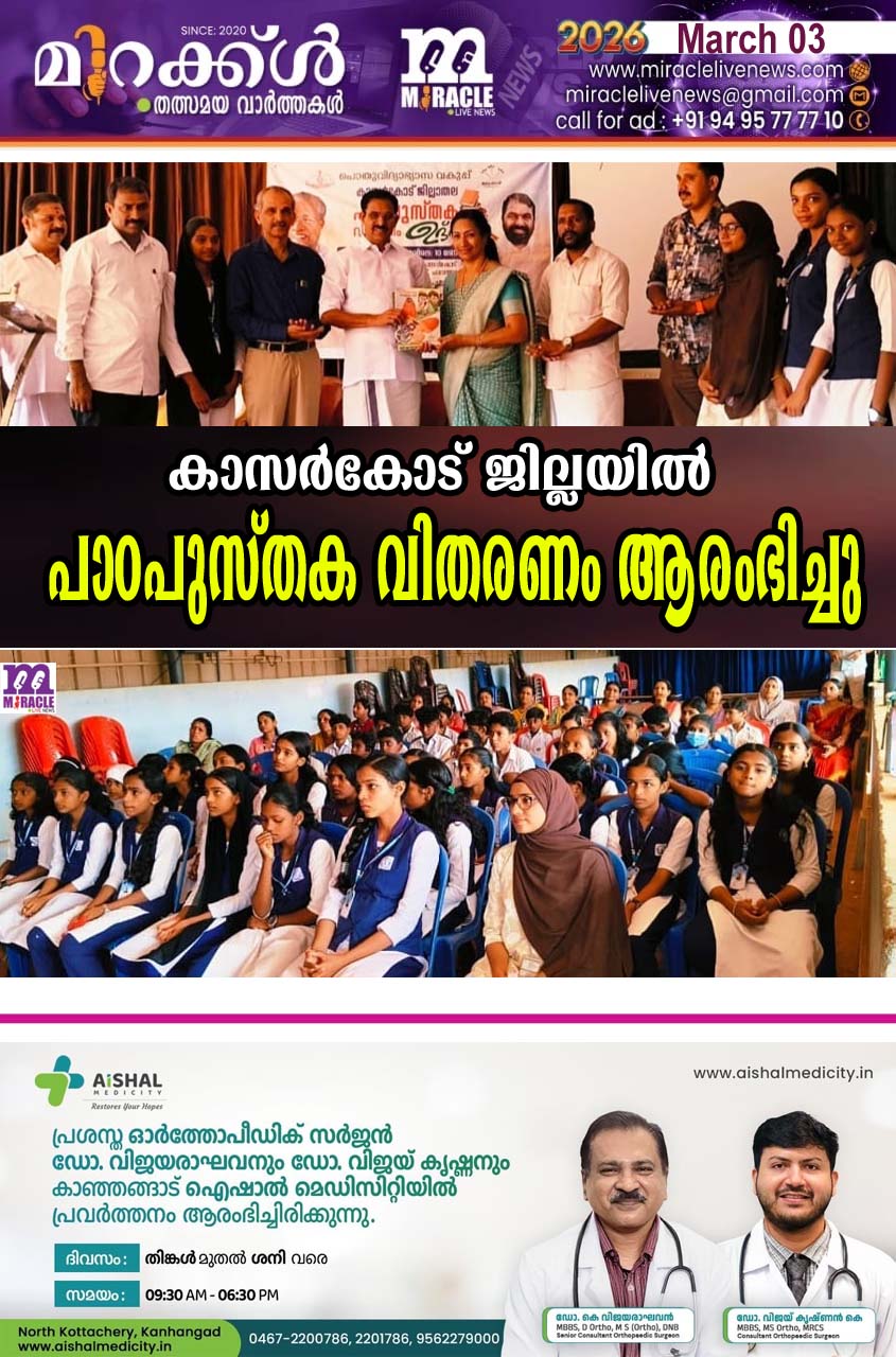 ചെമ്മനാട്: കാസര്കോട് ജില്ലയിലെ 202627 വര്ഷത്തേക്കുള്ള പാഠപുസ്തക വിതരണം ഉദുമ എം.എല്.എ അഡ്വ. സി.എച്ച്. കുഞ്ഞമ്പു ഉദ്ഘാടനം ചെയ്തു. കുടുംബശ്രീ ജില്ലാമിഷന് കോര്ഡിനേറ്റര് രതീഷ് പിലിക്കോട് അദ്ധ്യക്ഷത വഹിച്ചു. ജില്ലാ പഞ്ചായത്ത് ആരോഗ്യ വിദ്യാഭ്യാസ സ്റ്റാന്റിങ്ങ് കമ്മറ്റി ചെയര്മാന് എം. മനു കാസര്കോട് ജില്ലാ വിദ്യാഭ്യാസ ഓഫീസര് പി.സവിത, കാസര്കോട് എ.ഇ.ഒ നാരായണ.ഡി, ജി എച്ച് എസ് എസ് ചെമ്മനാട് പ്രധാനാധ്യാപിക മിനി തോമസ്, ടെക്സ്റ്റ് ബുക്ക് ഡിപ്പോ സ്റ്റോര് കീപ്പര് വി.വി.ശ്രീകാന്ത് , പി.ടി എ പ്രസിഡന്റ് ഹരിശ്ചന്ദ്രന്, സൂപ്പര്വൈസര് പി.എ. അര്ഷാന എന്നിവര് സംബന്ധിച്ചു.