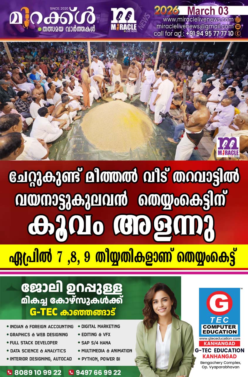 ചേറ്റുകുണ്ട് : പാലക്കുന്ന് കഴകം ചേറ്റുകുണ്ട് പ്രാദേശിക സമിതി പരിധിയില് ആദ്യമായി അരങ്ങേരുന്ന മീത്തല് വീട് തറവാട് വയനാട്ടുകുലവന് തെയ്യംകെട്ടിന്റെ മുന്നോടിയായി കൂവംഅളക്കല് നടന്നു. വലിയൊരു പുരുഷാരത്തെ സാക്ഷ്യമാക്കി വെളിച്ചപ്പാടുകളുടെ അനുബന്ധ അനുഷ്ഠാന നിര്വഹണത്തോടെയാണ് കൂവല് അളക്കല് ചടങ്ങ് നടന്നത്. പാലക്കുന്ന് ക്ഷേത്രത്തിലെയും മറ്റു വിവിധ ക്ഷേത്രങ്ങളിലെയും സ്ഥാനികര് നേതൃത്വം നല്കി. തിരുമുറ്റത്ത് കൂട്ടിയിട്ട നെല്ലിന് കൂമ്പാരത്തില് നിന്ന് ചൂട്ടൊപ്പിക്കാന് നിയുക്തനായ ബാലന് കൊളത്തിങ്കാലാണ് വാല്യക്കാരുടെ സഹായത്തോടെ കൂവം അളന്നത്. കുണ്ടംകുഴി പഞ്ചലിംഗേശ്വര, തൃക്കണ്ണാട് ത്രയംബകേശ്വര, കീഴൂര് ശാസ്താ ക്ഷേത്രങ്ങളിലേക്ക് 21 ഇടങ്ങഴി വീതവും, കോട്ടപ്പാറ വയനാട്ടുകുലവന് തറവാടിലേക്ക് 2 പറയും, പനയാല് മഹാ ലിങ്കേശ്വര, കരിപ്പൊടി ശാസ്താ, അരവത്ത് സുബ്രഹ്മണ്യ സ്വാമി, പൂച്ചക്കാട് മഹാവിഷ്ണു, ആലക്കോട് മഹാവിഷ്ണു, പാക്കത്തപ്പന് മഹാദേവ, പാക്കം മഹാവിഷ്ണു, ഉദയമംഗലം മഹാവിഷ്ണു, തണ്ണോട്ട് മഹാവിഷ്ണു, രാവണേശ്വരം പെരും തൃക്കോവിലപ്പന് , വാരിക്കാട്ട് മഹിഷ മര്ദ്ദിനി, തിരൂര് പാര്ത്ഥസാരഥി ക്ഷേത്രങ്ങളിലേക്ക് 11 ഇടങ്ങഴി വീതവുമാണ് കൂവം അളന്നത്. പാലക്കുന്ന് കഴകം ഭഗവതി ക്ഷേത്രം അടക്കം 13 ആരാധനാലയങ്ങളില് ദീപത്തിന് എണ്ണയും നല്കും. തെയ്യംകെട്ടിന് 2 കൈവീതുകള്ക്ക് 2 പറ വീതവും അനുബന്ധ ചടങ്ങുകള്ക്കായി 7 പറ വീതം പച്ചരിയും പുഴുങ്ങലരിയും അളന്നു. തറവാട്ടില് മഹോത്സവം നടക്കുമ്പോള് സമീപത്തെ ആരാധനാലയങ്ങളിലെ ദേവതാ സങ്കല്പങ്ങളെ മറന്നുപോകരുതെന്ന ഓര്മ്മപ്പെടുത്തലാണ് കൂവം അളക്കല് കൊണ്ട് ഉദ്ദേശിക്കുന്നത്. അളന്നു തിട്ടപ്പെടുത്തി ചാക്കുകളില് നിറച്ച കൂവം അളന്ന നെല്ല് ഏറെ വൈകാതെ തന്നെ അതത് ഇടങ്ങളില് എത്തിക്കുമെന്ന് ആഘോഷ കമ്മിറ്റി ചെയര്മാന് ഉദയമംഗലം സുകുമാരന് പറഞ്ഞു.ഏപ്രില് 7 മുതല് 9 വരെയാണ് ഇവിടെ തെയ്യംകെട്ട്.