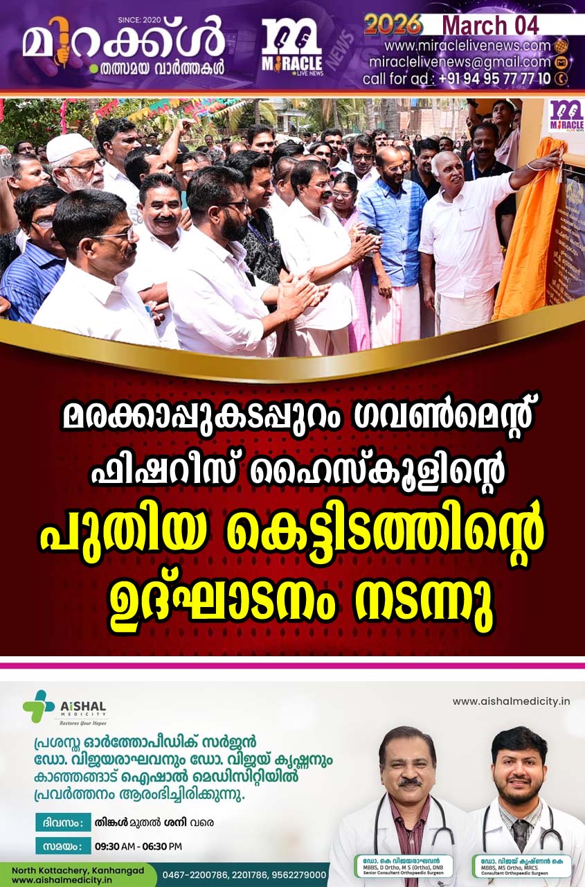 കാഞ്ഞങ്ങാട്: മരക്കാപ്പുകടപ്പുറം ഗവണ്മെന്റ് ഫിഷറീസ് ഹൈസ്കൂളിന് കാസര്കോട് വികസന പാക്കേജില് ഉള്പ്പെടുത്തി നിര്മ്മിച്ച കെട്ടിടത്തിന്റെ ഉല്ഘാടനം കാഞ്ഞങ്ങാട് എം എല് എ ഇ ചന്ദ്രശേഖരന് നിര്വ്വഹിച്ചു. കാഞ്ഞങ്ങാട് നഗരസഭാ ചെയര്മാന് വി വി രമേശന് അധ്യക്ഷത വഹിച്ചു. കാസര് കോട് പൊതു മരാമത്ത് വകുപ്പ് അസിസ്റ്റന്റ് എഞ്ചിനീയര് പി പ്രകാശന് റിപ്പോര്ട്ട് അവതരിപ്പിച്ചു. കാഞ്ഞങ്ങാട് നഗരസഭ വിദ്യാഭ്യാസ സ്റ്റാന്റിങ് കമ്മിറ്റി ചെയര്മാന് എം വിജയന്, കൗണ്സിലര്മാരായ വി വി മണി, വി അബൂബക്കര്, എം വി ഗായത്രി, എന്.കെ.സീമ, നീലേശ്വരം നഗരസഭാ കൗണ്സിലര്മാരായ ബീന ബാലദാസന്, റഷീദ മുഷ്താഖ്, പി വി പ്രകാശന്, നാദിറ പള്ളിവളപ്പില്, ശ്രീജ സത്യന്, വി വി ജാനു, മുന് കൗണ്സിലര് കെ കെ ബാബു, എ ശബരീശന്, പി വി ചന്ദ്രശേഖരന്, കെ കെ വല്സലന്, എ വി സത്യന്, ഷംസുദ്ദീന് ആവിയില്, എല് ഷംസുദ്ദീന്, അഡ്വ. നിസാം ഫലാഹ്, പിടിഎ പ്രസിഡന്റ് ഒ വി ബാബു, എസ് എം സി ചെയര്മാന് പ്രദീപ് മരക്കാപ്പ്, വികസനസമിതി ചെയര്മാന് മുഹമ്മദ്കുഞ്ഞി മാസ്റ്റര്, മദര് പി ടി എ പ്രസിഡന്റ് പി.വിനീത എന്നിവര് സംസാരിച്ചു. വാര്ഡ് കൗണ്സിലര് കെ സുമതി സ്വാഗതവും ഹെഡ്മാസ്റ്റര് കെ രവീന്ദ്രന് നന്ദിയും പറഞ്ഞു.