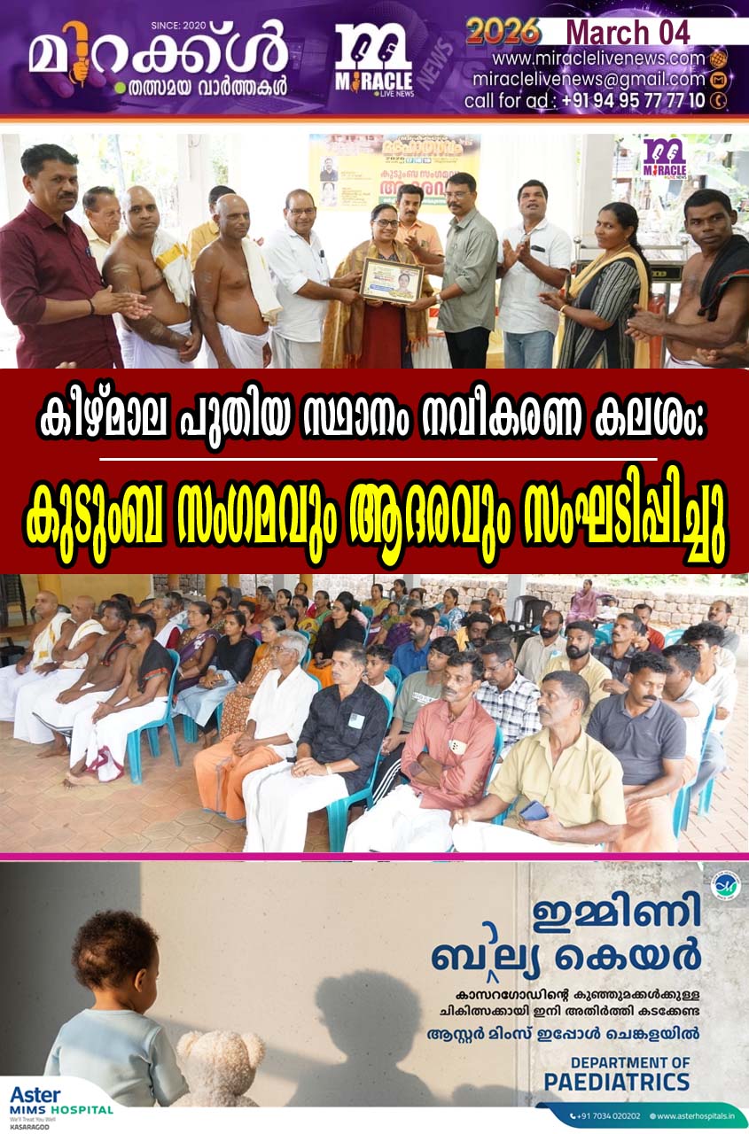 പുനഃപ്രതിഷ്ഠ ബ്രഹ്മകലശ മഹോത്സവം നടക്കുകയാണ്. ഉത്സവ ആഘോഷത്തോടനുബന്ധിച്ച് ക്ഷേത്ര സന്നിധിയില് കുടുംബ സംഗമവും ആദരവും സംഘടിപ്പിച്ചു. കുടുംബ സംഗമം വെള്ളരിക്കുണ്ട് തഹസില്ദാര് പി വി മുരളി ഉദ്ഘാടനം ചെയ്തു.ചടങ്ങില് കാസര്ഗോഡ് ജില്ലയിലെ മികച്ച വില്ലേജ് ഓഫീസറായി തിരഞ്ഞെടുത്ത കരിന്തളം വില്ലേജ് ഓഫീസര് കെ രാധികയെ തഹസില്ദാര് ആദരിച്ചു.ആഘോഷകമ്മിറ്റി ജനറല് കണ്വീനര് എം വി പത്മനാഭന് അധ്യക്ഷത വഹിച്ചു.കെ ഗംഗാധരന്,പി ടി നന്ദകുമാര്,പുതിയൂര് കുഞ്ഞിരാമന്,വാസു കരിന്തളം എന്നിവര് സംസാരിച്ചു.സാമ്പത്തിക കമ്മിറ്റി കണ്വീനര് കെ വി ശശികുമാര് സ്വാഗതവും മാതൃസമിതി സെക്രട്ടറി എം വി റീന നന്ദിയും പറഞ്ഞു