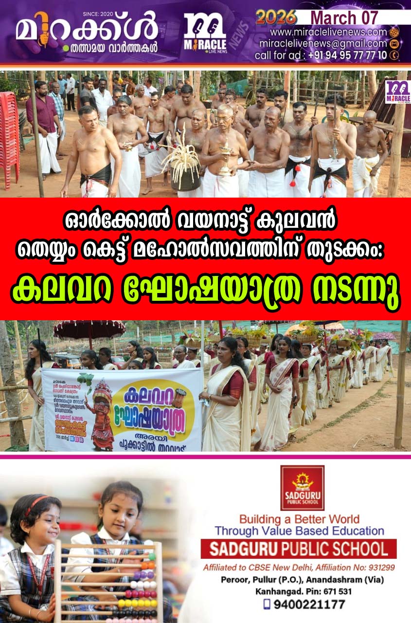 മടിക്കൈ: 28 വര്ഷത്തിന്റെ കാത്തിരിപ്പിന് വിരാമമിട്ട നടക്കുന്ന വയനാട്ടു കുലവന് തെയ്യംകെട്ട് മഹോത്സവത്തിന് തുടക്കം കുറിച്ച് രാവിലെ കലവറ ഘോഷയാത്ര നടന്നു.പെരിയാങ്കോട്ട് ഭഗവതി ക്ഷേത്രത്തിന്റെയും ക്ഷേത്ര പ്രാദേശിക സമിതികള്, വിവിധ ക്ഷേത്രങ്ങള്, കഴകങ്ങള്, സ്ഥാനങ്ങള് എന്നിവ കേന്ദ്രികരിച്ച് കലവറ ഘോഷയാത്രകള് നടന്നു. ആയിരകണക്കിന് സ്ത്രീകളും പുരുഷന്മാരും ഉത്സവത്തിന് ആവശ്യമായ അരിയും ഭക്ഷണ സാധങ്ങളും കന്നി കലവറയിലേക്ക് എത്തിച്ചു. നാടെങ്ങും ഉത്സവലഹരിയിലമര്ന്നിരിക്കുകയാണ്. ഇനി മൂന്ന് നാള് വയനാട്ടുകുലവന് തെയ്യം കെട്ട് മഹോത്സവത്സവം വിജയിപ്പിക്കാനുള്ള രാപ്പകല് അധ്വാനത്തിലാണ് ആഘോഷകമ്മിറ്റി. ആഘോഷ കമ്മിറ്റി ചെയര്മാനും മുന് പഞ്ചായത്ത് പ്രസിഡന്റുമായ സി പ്രഭാകരന് ചെയര്മാനും, ഗംഗാധരന് താളിക്കുണ്ട് ജനറല് കണ്വീനറും, അനില് മടിക്കൈ വൈസ് ചെയര്മാനും,