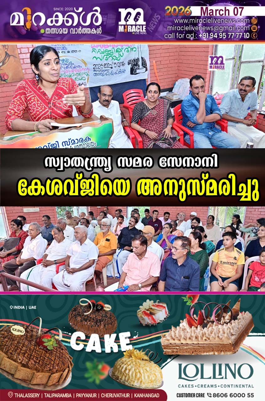 അമ്പലത്തറ: സ്വാതന്ത്ര്യ സമര സേനാനി കേശവ്ജിയുടെ 21ാം ചരമവാര്‍ഷികവും റിപ്പബ്ലിക് സദസ്സും മൂന്നാംമൈല്‍ കേശവ്ജി സ്മാരക പൊതുജന വായനശാലയില്‍ നടന്നു. അഡ്വ.പി.വി. ഹരീഷ് അനുസ്മരണഭാഷണം നടത്തി. അക്ഷരസൗഹൃദം പരിപാടിയുടെ ഭാഗമായി ‘മന്ദപ്പൂമാരന്റെ കന്യകകള്‍’ എന്ന കഥാസമാഹാരം ചര്‍ച്ച ചെയ്തു.പഞ്ചായത്തംഗം സി.കൃഷ്ണകുമാര്‍, കഥാകൃത്ത് വി.സുരേഷ്‌കുമാര്‍, പ്രീതി ദിലീപ്, അശ്വിനി ഐങ്ങോത്ത്, അനില്‍കുമാര്‍ ചുണ്ണംകുളം തുടങ്ങിയവര്‍ പങ്കെടുത്തു. അമ്പലത്തറ നാരായണന്‍ അധ്യക്ഷത വഹിച്ചു. ഗോപി മുളവന്നൂര്‍ സ്വാഗതവും പി വി ജയരാജ് നന്ദിയും പറഞ്ഞു.