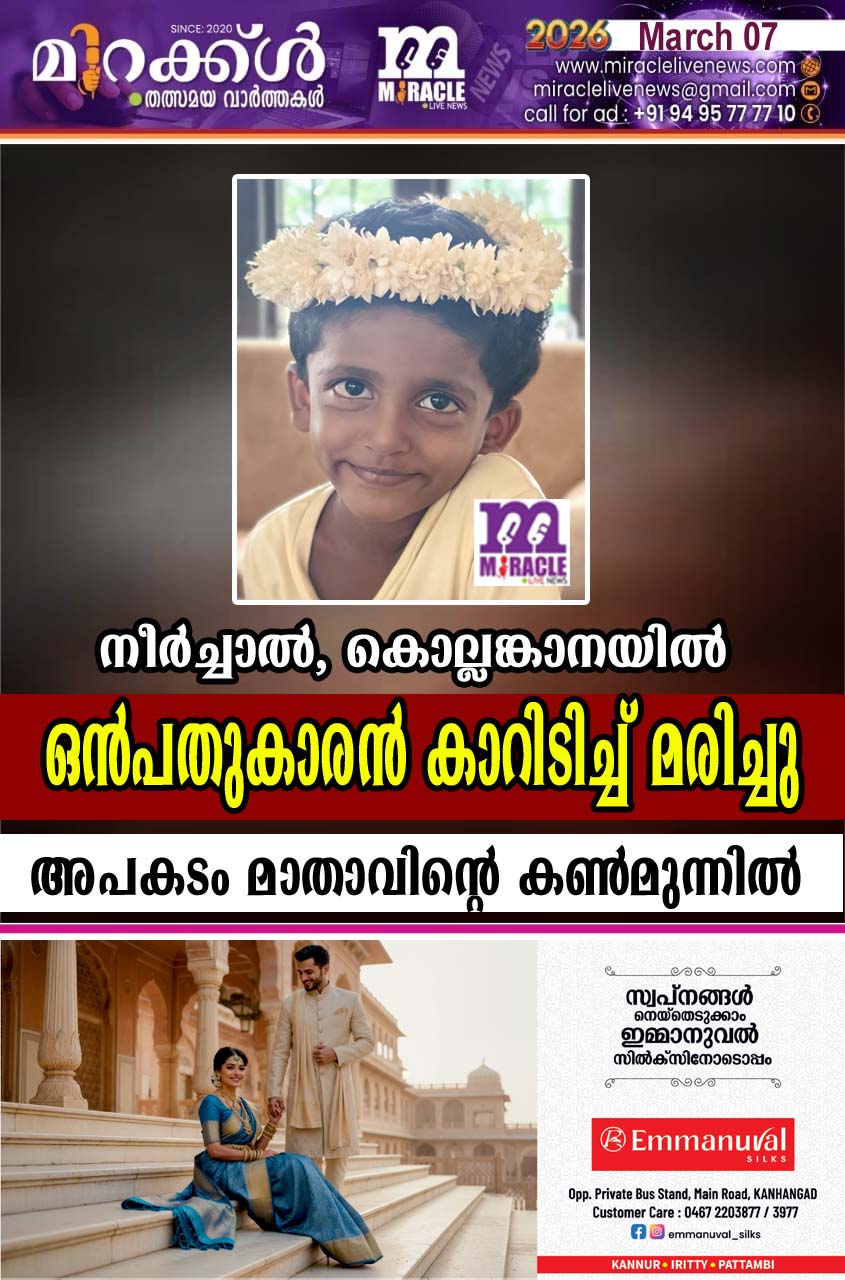 കാസര്കോട്: മാതാവിന്റെ കണ്മുന്നില് വച്ച് 9 വയസുകാരന് കാറിടിച്ചു മരിച്ചു. കൊല്ലങ്കാന, ഏവിഞ്ചയിലെ സാദിഖ് ഷംസീന ദമ്പതികളുടെ മകന് ഷക്കീര് ആണ് മരിച്ചത്. ഇന്ന് ഉച്ചയ്ക്ക്11 മണിയോടെ കൊല്ലങ്കാനയിലാണ് അപകടം. മാതാവ് ഷംസീനയ്ക്കൊപ്പം കാസര്കോട് ഭാഗത്തേക്ക് പോകാനായെത്തിയതായിരുന്നു ഷക്കീര്. ഇതിനിടയിലാണ് കാറിടിച്ചത്. അപകടത്തിന് ഇടയാക്കിയ കാറില് തന്നെ ഷക്കീറിനെ കാസര്കോട്ടെ ആശുപത്രിയില് എത്തിച്ചുവെങ്കിലും ജീവന് രക്ഷിക്കാനായില്ല. കിളിങ്കാറിലുള്ള എംസിആര്സി സ്കൂളിലെ വിദ്യാര്ത്ഥിയാണ്. സഹോദരങ്ങള്: ഷക്കീര്.ഷാമില് , ഷാഹിര്.