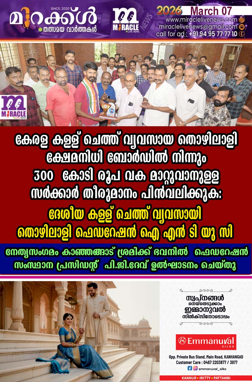 കാഞ്ഞങ്ങാട്: കേരള കള്ള് ചെത്ത് വ്യവസായ തൊഴിലാളി ക്ഷേമനിധി ബോര്ഡില് നിന്നും 300 കോടി രൂപ വകമാറ്റുവാനുള്ള സര്ക്കാര് തീരുമാനം പിന്വലിക്കുക, സംസ്ഥാനത്ത് വ്യാജ മദ്യവും മയക്കുമരുന്നു കളും തടയുക,ബാറുകളുടെ പ്രവര്ത്തന സമയം 12 മണിക്കൂറായി നിജപ്പെടുത്തുക,കള്ള് ഷാപ്പുകളുടെ ദൂരപരിധി 400 മീറ്ററില് നിന്നും 200 മീറ്ററായി കുറയ്ക്കുക,മിനിമം വേജസ് നോട്ടിഫിക്കേഷന് ഉടന് പുറപ്പെടുവിക്കുക തുടങ്ങിയ ആവശ്യങ്ങള് ഉന്നയിച്ച് ദേശീയ കള്ള് ചെത്ത് വ്യവസായ തൊഴിലാളി ഫെഡറേഷന് ഐ എന് ടി യു സി നേതൃസംഗമം നടന്നു. കാഞ്ഞങ്ങാട് ശ്രമിക്ക് ഭവനില് നടന്ന നേതൃസംഗമവും അനുമോദന ചടങ്ങും ഫെഡറേഷന് സംസ്ഥാന പ്രസിഡണ്ടും മിനിമം വേജസ് അഡ്വൈസറി ബോര്ഡ് മെമ്പറുമായ പി.ജി.ദേവ് ഉല്ഘാടനം ചെയ്തു.