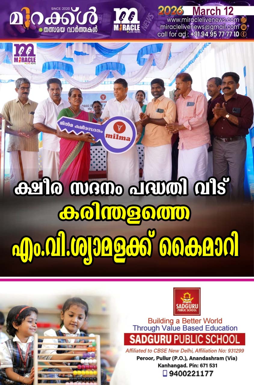 കരിന്തളം:മില്മ മലബാര് മേഖലാ സഹകരണ ക്ഷീരോത്പാദക യൂണിയന് സംഘങ്ങളിലെ സ്വന്തമായി വീടില്ലാത്ത സാമ്പത്തികമായി പിന്നോക്കം നില്ക്കുന്ന ക്ഷീര കര്ഷകര്ക്ക് വീട് നിര്മ്മിച്ച് നല്കുന്ന ക്ഷീര സദനം പദ്ധതി പ്രകാരം നിര്മ്മാണം പൂര്ത്തിയാക്കിയ കാലിച്ചാമരം ക്ഷീര സംഘത്തിലെ അംഗം കരിന്തളത്തെ എം.വി.ശ്യാമളയുടെ വീടിന്റെ താക്കോല് ദാന ചടങ്ങ് നടന്നു.കരിന്തളത്ത് നടന്ന ചടങ്ങില് മില്മ ചെയര്മാന് കെ.എസ്. മണി വീടിന്റെ താക്കോല് എം വി ശ്യാമളക്ക് കൈമാറി. കിനാനൂര് കരിന്തളം ഗ്രാമപഞ്ചായത്ത് പ്രസിഡന്റ് എം.രാജന് അദ്ധ്യക്ഷത വഹിച്ചു.