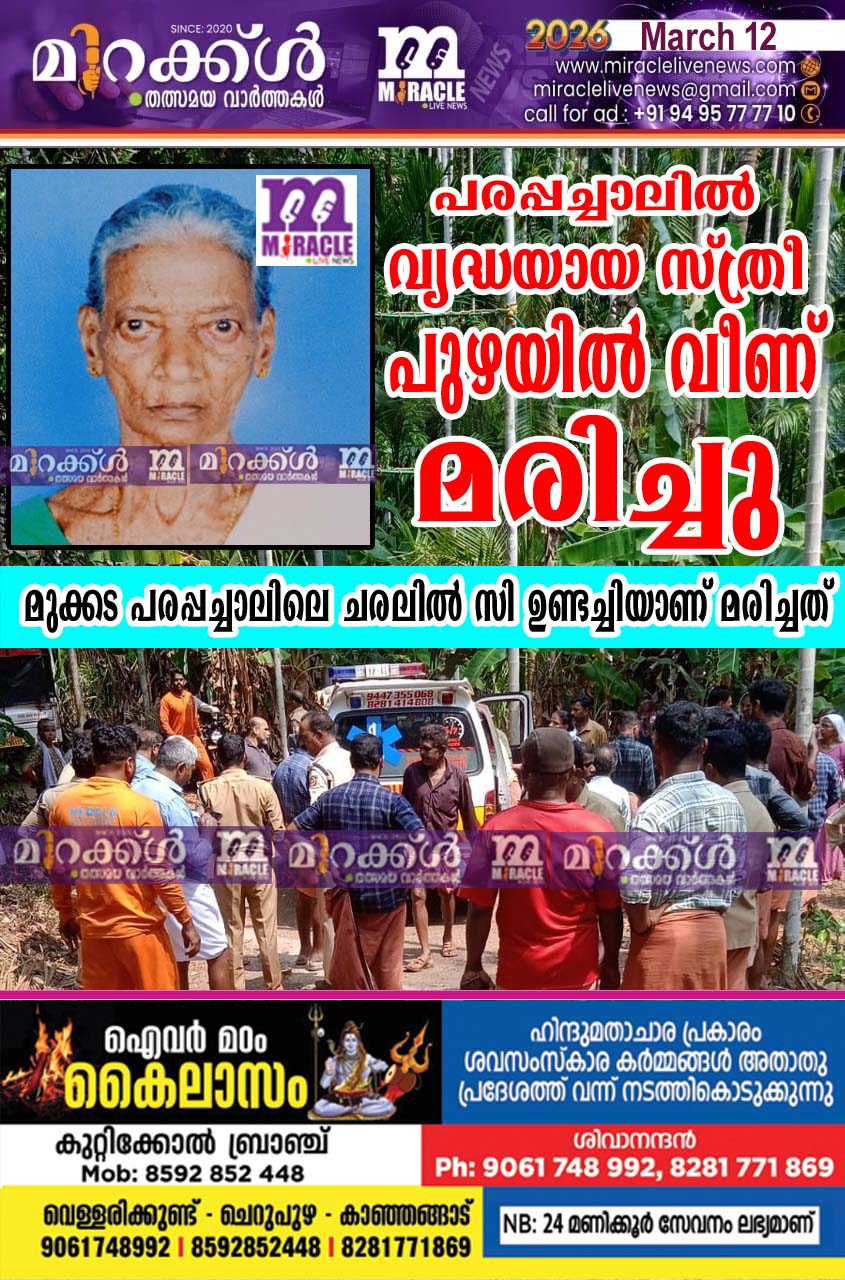 കരിന്തളം:വൃദ്ധയായ സ്ത്രീ പുഴയില് വീണ് മരണപ്പെട്ടു. മുക്കട പരപ്പച്ചാലിലെ ചരലില് സി ഉണ്ടച്ചിയെ (85) ആണ് വീടിനു സമീപം പുഴയില് വീണ് മരണപ്പെട്ട നിലയില് കാണപ്പെട്ടത്. ഇന്നുച്ചക്ക് 12 മണി മുതല് ഉണ്ടച്ചിയെ വീട്ടില് നിന്നും കാണാതാവുകയായിരുന്നു. തുടര്ന്ന് വീടിനു സമീപത്തെ പുഴയില് ഒഴുക്കില് പെട്ടു എന്ന സംശയത്തെ തുടര്ന്ന് നാട്ടുകാരുടെയും ചിറ്റാരിക്കാല് പോലീസിന്റെയും കാഞ്ഞങ്ങാട് നിന്നും വന്ന ഫയര്ഫോഴ്സിന്റെയും നേതൃത്വത്തില് ഊര്ജ്ജിതമായ തിരച്ചില് നടത്തുന്നതിനിടയില് ഉച്ചയ്ക്ക് 2 .30 ഓടെ വീടിനു സമീപത്തു നിന്ന് തന്നെ പുഴയില് നിന്നും മൃതദേഹം കണ്ടെത്തുകയായിരുന്നു.ഭര്ത്താവ് പരേതനായ ടി വി അമ്പു .മക്കള്: വിശ്വംഭരന്, രവീന്ദ്രന് (ഡ്രൈവര്) കുഞ്ഞികൃഷ്ണന്. മരുമക്കള്:സുമിത്ര, സുജാത, ശാലിനി. സഹോദരങ്ങള്:നാരായണി ,ജാനകി പരേതരായ കണ്ണന്, കാരിക്കുട്ടി ,അമ്പൂഞ്ഞി, രാഘവന്, വെള്ളച്ചി . ചിറ്റാരിക്കാല് പോലീസ് ഇന്ക്വസ്റ്റ് നടത്തിയ മൃതദേഹം പോസ്റ്റുമോര്ട്ടത്തിനായി ജില്ലാ ആശുപത്രിയിലേക്ക് മാറ്റി.സംസ്കാരം നാളെ ഉച്ചയ്ക്ക് ഒരു മണിക്ക് വീട്ടുവളപ്പില്.