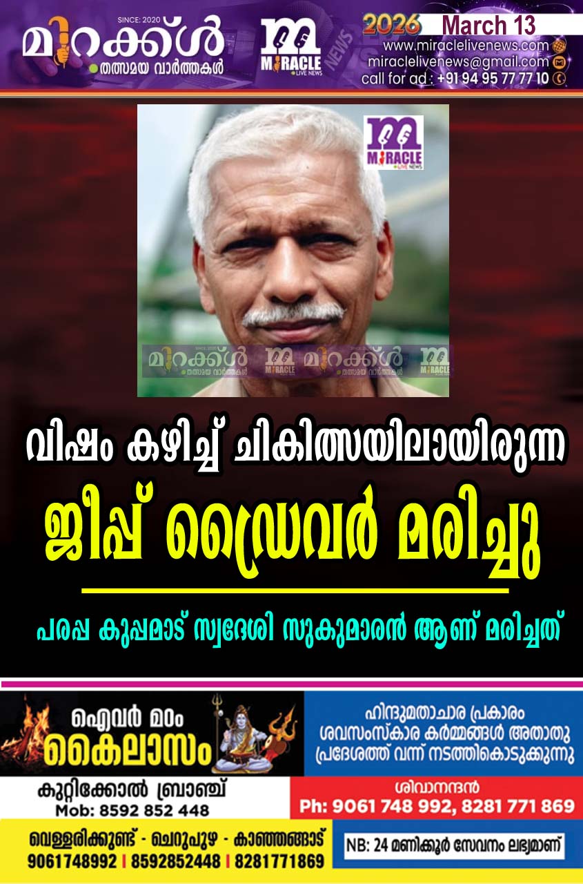 പരപ്പ: വിഷം കഴിച്ച് ചികിത്സയിലായിരുന്ന ജീപ്പ് ഡ്രൈവര് മരിച്ചു.പരപ്പ കുപ്പമാട് സ്വദേശി സുകുമാരന് (60) ആണ് ചികിത്സയ്ക്കിടെ ഇന്നലെ രാത്രി കണ്ണൂരിലെ സ്വകാര്യ ഹോസ്പിറ്റലില് ഇന്നലെ രാത്രി മരിച്ചത്. ചൊവ്വാഴ്ച ഉച്ചയ്ക്ക് വട്ടിപുന്ന റോഡിന് സമീപത്ത് കോളയില് എലി വിഷം കലക്കി കുടിച്ച് അവശനിലയില് കാണുകയായിരുന്നു. ഉടനെ പരപ്പയിലെ സ്വകാര്യ ആശുപത്രിയില് എത്തിച്ചു. നില ഗുരുതരമായതിനാല് കണ്ണൂരിലേക്ക് മാറ്റുകയായിരുന്നു.