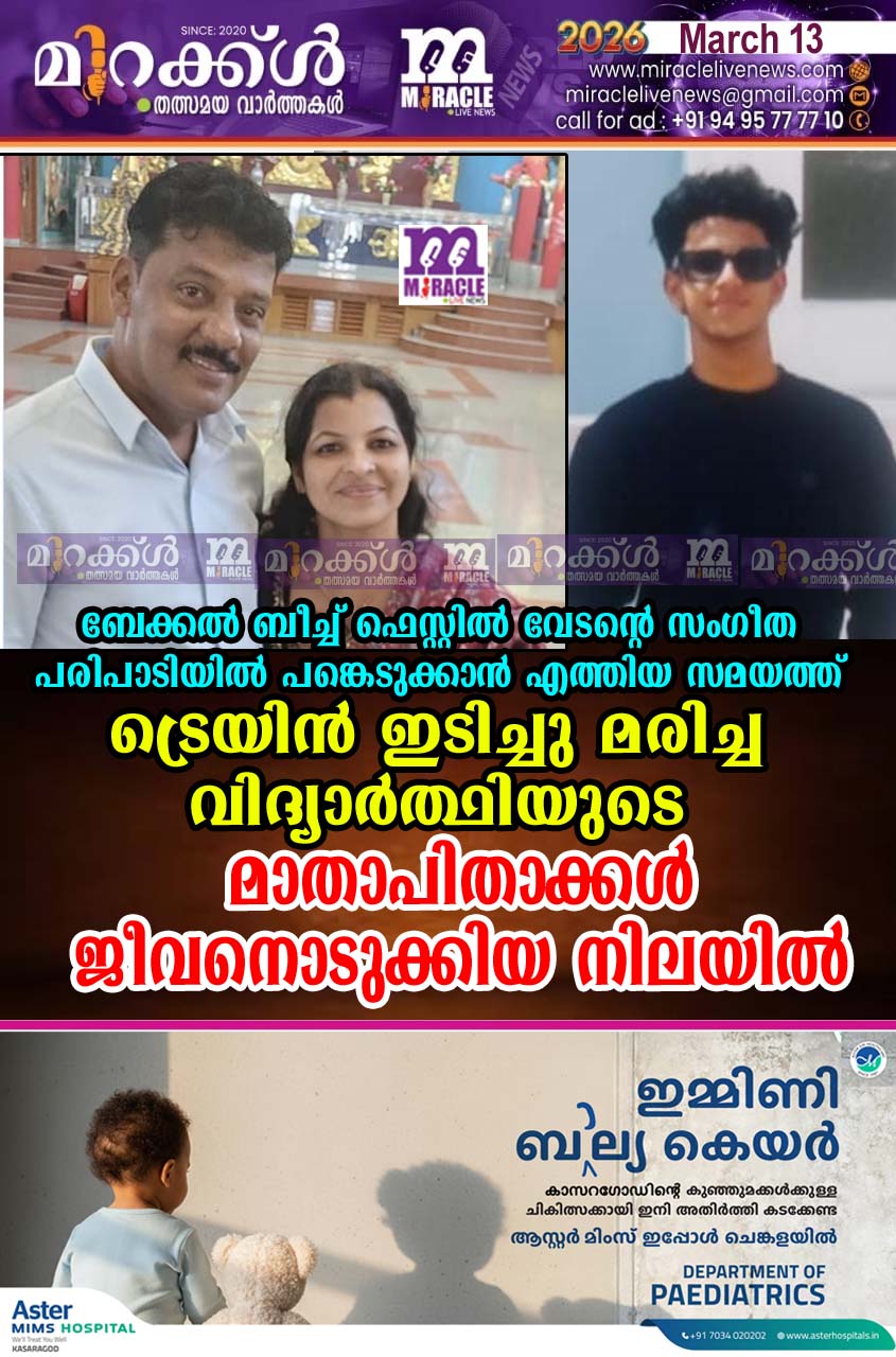 പൊയ്നാച്ചി: ബേക്കല് ബീച്ച് ഫെസ്റ്റില് വേടന്റെ സംഗീത പരിപാടിയില് പങ്കെടുക്കാന് എത്തിയ സമയത്ത് ട്രെയിന് ഇടിച്ചു മരിച്ച എഞ്ചിനീയറിംഗ് വിദ്യാര്ത്ഥിയുടെ മാതാപിതാക്കളെ ജീവനൊടുക്കിയ നിലയില് കണ്ടെത്തി. പൊയ്നാച്ചി, പറമ്പിലെ വേണുഗോപാലന് നായര് (55), ഭാര്യ സ്മിത (45) എന്നിവരാണ് മരിച്ചത്. വെള്ളിയാഴ്ച രാവിലെ വീടിന്റെ സെന്ട്രല് ഹാളിലാണ് മൃതദേഹം കണ്ടെത്തിയത്. വിവരമറിഞ്ഞ് ബേക്കല് ഡി.വൈ.എസ്.പി എം.പി. ആസാദിന്റെ നേതൃത്വത്തില് പൊലീസ് സ്ഥലത്തെത്തി. വേണുഗോപാലന് സ്മിത ദമ്പതികളുടെ ഏകമകനും മംഗ്ളൂരുവിലെ എഞ്ചിനീയറിംഗ് വിദ്യാര്ത്ഥിയുമായിരുന്ന എം ശിവനന്ദന് (19) ഡിസംബര് 29ന് രാത്രിയാണ് ബേക്കല് ട്രെയിന് തട്ടി മരിച്ചത്. മേല്പ്പറമ്പ് പോലീസ് അസ്വാഭാവിക മരണത്തിന് കേസ് രജിസ്റ്റര് ചെയ്തിട്ടുണ്ട്.