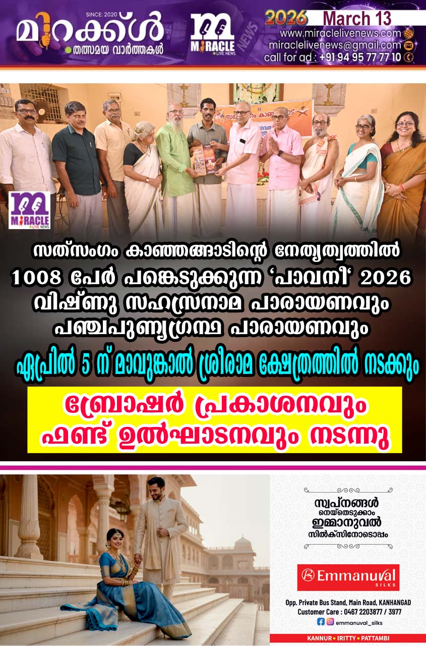 മാവുങ്കാല്:സത്സംഗം കാഞ്ഞങ്ങാടിന്റെ ആഭിമുഖ്യത്തില്1008 പേര് അണിനിരക്കുന്ന പാവനീ 2026 വിഷ്ണു സഹസ്രനാമ പാരായണവും പഞ്ച പുണ്യഗ്രന്ഥ പാരായണവും ഏപ്രില് 5 ന് മാവുങ്കാല് ശ്രീരാമക്ഷേത്രത്തില് വിവിധങ്ങളായ പരിപാടികളോടെ നടക്കും. പരിപാടിയുടെ പ്രചരണാര്ത്ഥം നടന്ന ബ്രോഷര് പ്രകാശന കര്മ്മം സത്സംഗം കാഞ്ഞങ്ങാടിന്റെ കാര്യദര്ശികളായ ബ്രഹ്മശ്രീ എടമന ഈശ്വരന് തന്ത്രികള്, കെ.ഹരിഹരന് നമ്പ്യാര് എന്നിവരുടെ സാന്നിധ്യത്തില് ബ്രഹ്മശ്രീ മാടമന ശങ്കരനാരായണന് നമ്പൂതിരിക്ക് ആദ്യ പ്രതി സമര്പ്പിച്ച് മാനവ വര്മ്മരാജ നിര്വ്വഹിച്ചു. പരിപാടിയുടെ വിജയത്തിനായി ഏര്പ്പെടുത്തിയ നിധിശേഖരണ പദ്ധതിയുടെ ആദ്യ ഗഡു ഡോ:സി.കെ.രാജയില് നിന്നും സംഘാടക സമിതി വര്ക്കിംങ് ചെയര്മാന് എസ്.പി.ഷാജിയും സാമ്പത്തിക കമ്മിറ്റി ചെയര്മാന് എം.പ്രദീപ് കുമാറും ചേര്ന്ന് സ്വീകരിച്ചു.
