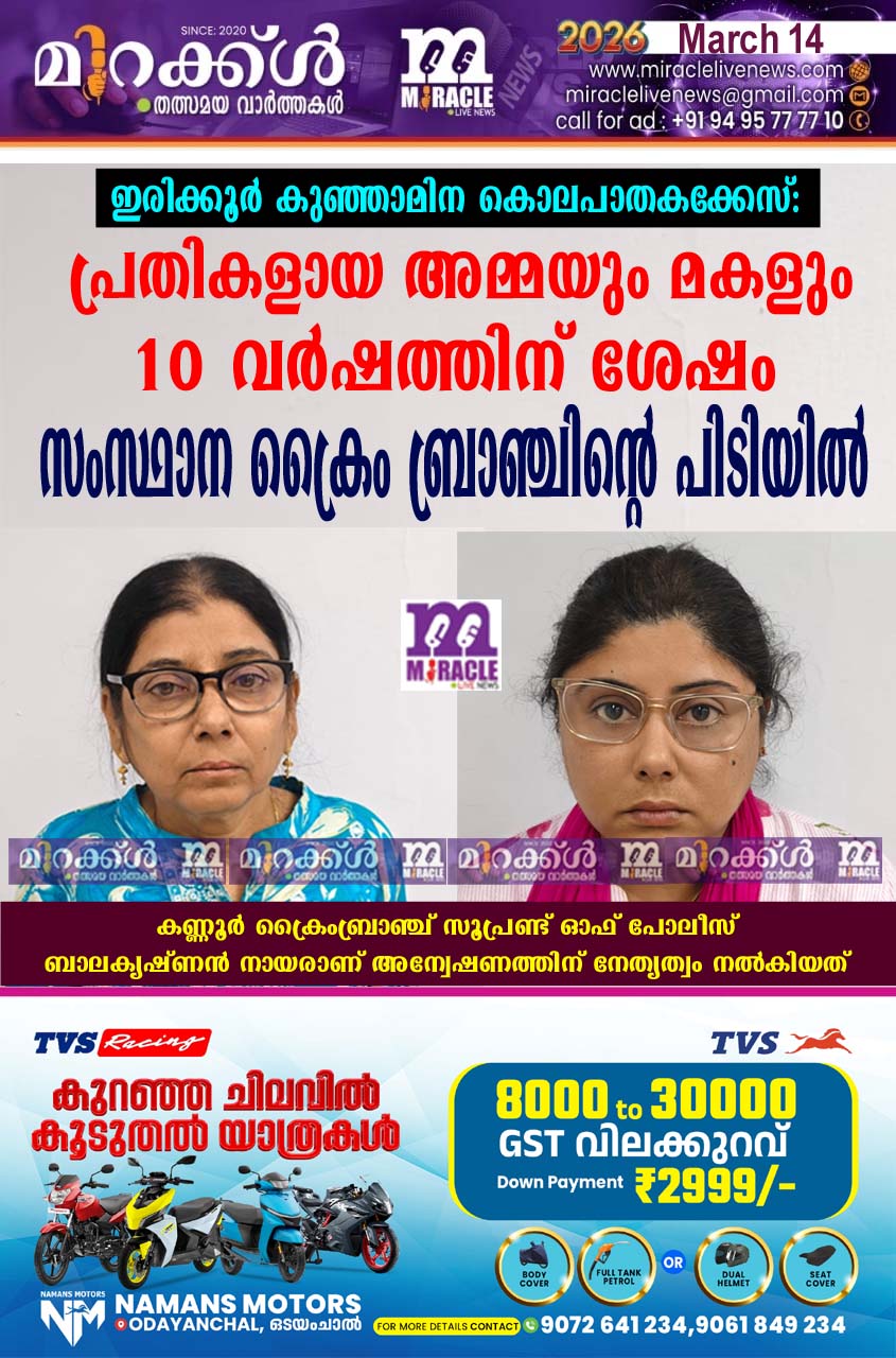 കണ്ണൂര്: ഇരിക്കൂര് കുഞ്ഞാമിന കൊലപാതകക്കേസിലെ പ്രതികള് 10 വര്ഷത്തിന് ശേഷം സംസ്ഥാന ക്രൈം ബ്രാഞ്ച് പിടിയില് . 2016 ഏപ്രില് 30ന് ഇരിക്കൂര് പോലീസ് സ്റ്റേഷന് പരിധിയില് പെട്ട സിദ്ദിഖ് നഗര് എന്ന സ്ഥലത്തു താമസിക്കുകയായിരുന്ന മെരടന് കുഞ്ഞാമിന (60) എന്ന സ്ത്രീയെ ക്രൂരമായി കൊലപ്പെടുത്തി സ്വര്ണാഭരണങ്ങള് കവര്ന്നു രക്ഷപ്പെട്ട പ്രതികളായ ന്യൂദല്ഹി നാങ്ളോയി നസീര് അലിയുടെ ഭാര്യ പര്വീണ് ബാനു (55), മകള്