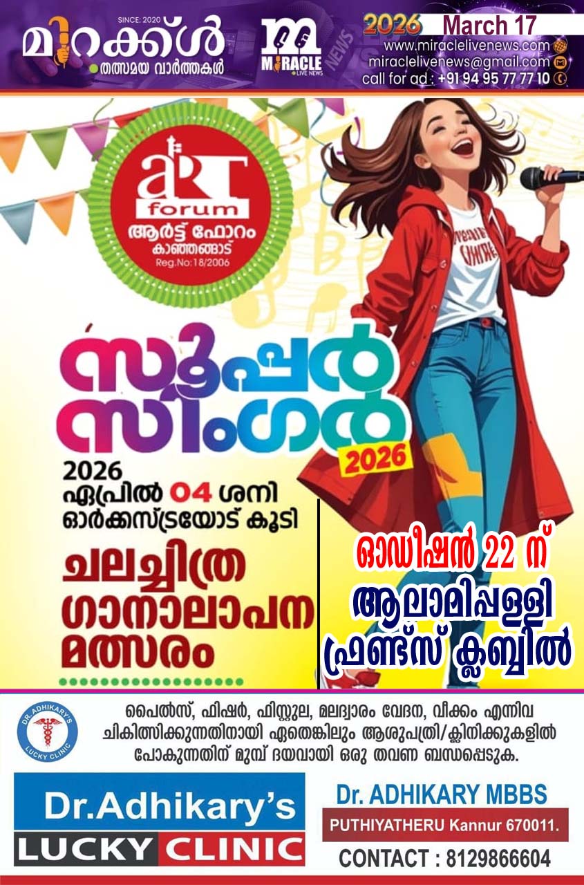 ആര്‍ട്ട് ഫോറം സൂപ്പര്‍ സിംഗര്‍ ചലച്ചിത്ര ഗാനാലാപന മത്സരം: ഓഡീഷന്‍ 22 ന് ആലാമിപ്പള്ളി ഫ്രണ്ട്‌സ് ക്ലബ്ബില്‍