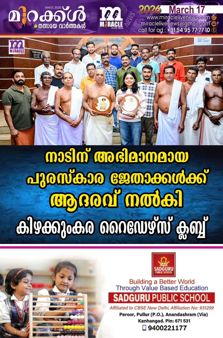 കാഞ്ഞങ്ങാട്:ജീവകാരുണ്യ പ്രവര്ത്തനം, രക്തദാനം, കഷ്ടത അനുഭവിക്കുന്ന രോഗികള്ക്ക് ധനസഹായം തുടങ്ങി സാമൂഹ്യ സാംസ്കാരിക ആരോഗ്യ വിദ്യാഭ്യാസ ജീവകാരുണ്യ കലാസാംസ്കാരിക മേഖലയില് വ്യത്യസ്തവും നൂതനവുമായ നിരവധി പ്രവര്ത്തനങ്ങളിലൂടെ നാടിനെ ചേര്ത്തുനിര്ത്തുന്ന യുവാക്കളുടെ കൂട്ടായ്മയില് കിഴക്കുംകര കേന്ദ്രീകരിച്ച് പ്രവര്ത്തിക്കുന്ന റൈഡേഴ്സ്ആര്ട്സ് ആന്ഡ് സ്പോര്ട്സ് ക്ലബ്ബ് നാടിന് അഭിമാനമായി വിവിധ മേഖലയില് പുരസ്കാര ജേതാക്കളായ അഭിമാന താരങ്ങളെ ആദരിച്ചു. കേരള സര്ക്കാര് സാംസ്കാരിക വകുപ്പ് കേരള ഫോക് ലോര് അക്കാദമി പൂരക്കളി അവാര്ഡ് നേടിയ കിഴക്കുംകര പുള്ളിക്കാരന് അമ്മ ദേവസ്ഥാനം ആചാര സ്ഥാനികന് പൂരക്കളി കലാകാരനുമായ കുമാരന് വെളിച്ചപ്പടച്ചന് ,മുഖ്യമന്ത്രിയുടെ വിദ്യാര്ത്ഥി പ്രതിഭാ പുരസ്കാരം നേടിയ കിഴക്കുംകര കണിയാം കുണ്ടിലെ കെ ബാബുവിന്റെയും ഉഷയുടെയും മകള് കുമാരി കെ ആദിത്യ എന്നിവരെയാണ് ആദരിച്ചത്. കിഴക്കുംകര ദേവസ്ഥാനം പരിസരത്ത് നടന്ന ചടങ്ങില് ക്ലബ്ബ് പ്രസിഡന്റ് മുഹമ്മദ് ഫവാസ് ഉപഹാരങ്ങള് നല്കി ആദരിച്ചു. ദേവസ്ഥാനം മുഖ്യ സ്ഥാനികന് കെ രാമകൃഷ്ണന്,ക്ലബ്ബ് രക്ഷാധികാരി രാജേഷ് ഭായി,എക്സിക്യൂട്ടീവ് കമ്മിറ്റി അംഗങ്ങളായ കെ വിനയന്, കെ രാജു, മനോജ് മണലില്, രാജീവന് കാറ്റാടി, എം രാകേഷ്, രാജീവന് കിഴക്കും കരം,ദേവസ്ഥാനം ജനറല്സെക്രട്ടറി എം സതീശന്, സെക്രട്ടി വി നാരായണന് തുടങ്ങിയവര് പങ്കെടുത്തു.
