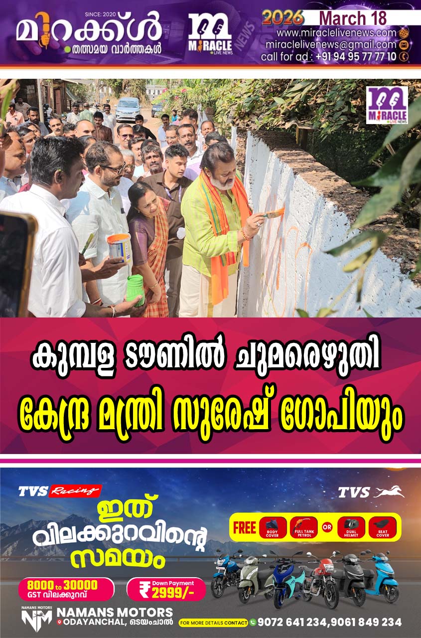 മഞ്ചേശ്വരം: നിയോജകമണ്ഡലത്തില് എന്ഡിഎ തെരഞ്ഞെടുപ്പ് പ്രചരണത്തിന്റെ ഭാഗമായി കേന്ദ്ര മന്ത്രി സുരേഷ് ഗോപി കുമ്പള ടൗണില് ചുമരെഴുതി. മഞ്ചേശ്വരം മണ്ഡലം എന്ഡിഎ സ്ഥാനാര്ത്ഥി കെ. സുരേന്ദ്രന്, ബിജെപി കാസര്കോട് ജില്ലാ പ്രസിഡന്റ് എംഎല് അശ്വിനി, എന്ഡിഎ കണ്വീനര് വിജയ് കുമാര് റൈ, സംസ്ഥാന കമ്മിറ്റി: അംഗങ്ങളായ വി. രവീന്ദ്രന്, സുരേഷ് കുമാര് ഷെട്ടി, കുമ്പള മണ്ഡലം കമ്മിറ്റി പ്രസിഡന്റ് സുനില് അനന്തപുരം, വിക്രം പൈ, സുധാകര് കാമത്ത്, പ്രേമലത എസ് ഉള്പ്പെടെയുള്ള നേതാക്കള് സംബന്ധിച്ചു.