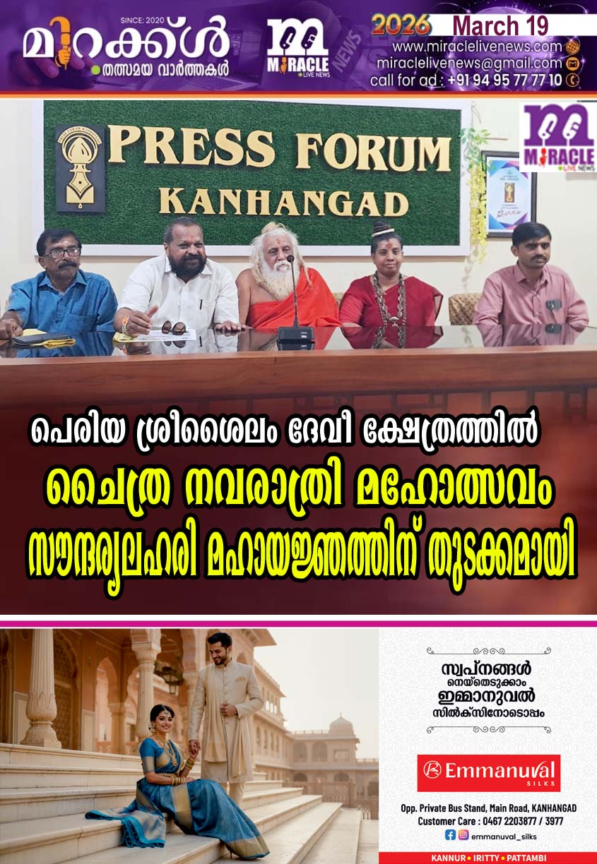 കാഞ്ഞങ്ങാട്: അദ്വൈത സിദ്ധാന്തം ശ്രീ വിദ്യാ സമ്പ്രദായം ഋഷിപരമ്പര അനുസരിച്ച് പ്രവര്ത്തിച്ചുവരുന്ന ഓം ശ്രീ മഠത്തിന്റെ മൂലക്ഷേത്രമായ പെരിയ ശ്രീ ശൈലം ദേവി ക്ഷേത്രത്തില് ചൈത്ര നവരാത്രി മഹോല്സ