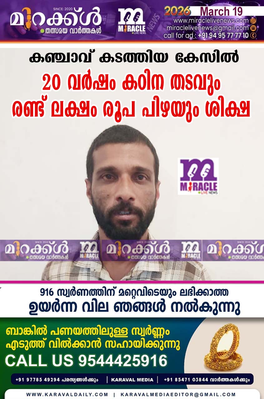 ഇരുപത് വര്ഷം കഠിന തടവും രണ്ട് ലക്ഷം രൂപ പിഴയും ശിക്ഷ. ചെങ്കള ബംബ്രാണി നഗര് ഷബീബ് മന്സിലില് സൈനുദ്ദീന് മകന് ബി എസ് അബ്ദുള് സക്കീര് (40) നെയാണ് കാസര്കോട് അഡീഷണല് ഡിസ്ട്രിക്റ്റ് ആന്റ് സെഷന്സ് കോടതി (രണ്ട്) ജഡ്ജ് രാമു രമേഷ് ചന്ദ്രഭാനു ശിക്ഷിച്ചത്. പിഴയടച്ചില്ലെങ്കില് ആറ് മാസം അധിക തടവും അനുഭവിക്കണം. പ്രതി സ്കൂള് കുട്ടികള്ക്ക് മയക്ക് മരുന്ന് വില്പന നടത്തുന്നതായി വെളിപ്പെട്ടതിന്റെ അടിസ്ഥാനത്തില് വിദ്യാനഗര് പോലീസ് സ്റ്റേഷനിലും , കാസര്കോട് എക്സൈസ് എന്ഫോഴ്സ്മെന്റ് ആന്റ് ആന്റിനര്കോട്ടിക്ക് സ്പെഷ്യല് സ്ക്വാഡിലും സമാനമായ കേസുകള് നിലവിലുണ്ട്. പ്രതി കേസ് വിധി പറയാനിരിക്കെ കോടതിയില് ഹാജരാകാതെ എറണാകുളത്ത് ഒളിവില് കഴിയുകയായിരുന്ന പ്രതിയെ ജില്ലാ പോലീസ് മേധാവിയുടെ നിര്ദേശപ്രകാരം വിദ്യാനഗര് ഇന്സ്പെക്ടര് വിനീഷ് കുമാറിന്റെ നേതൃത്വത്തില് എറണാകുളത്ത് വച്ച് സാഹസികമായി പിടികൂടി കോടതിയില് ഹാജരാക്കിയ പ്രതിയെ ഈ കേസില് റിമാന്റ് ചെയ്യുകയും , തുടര്ന്ന് കേസില് വിധി പറയുകയുമാണുണ്ടായത് .